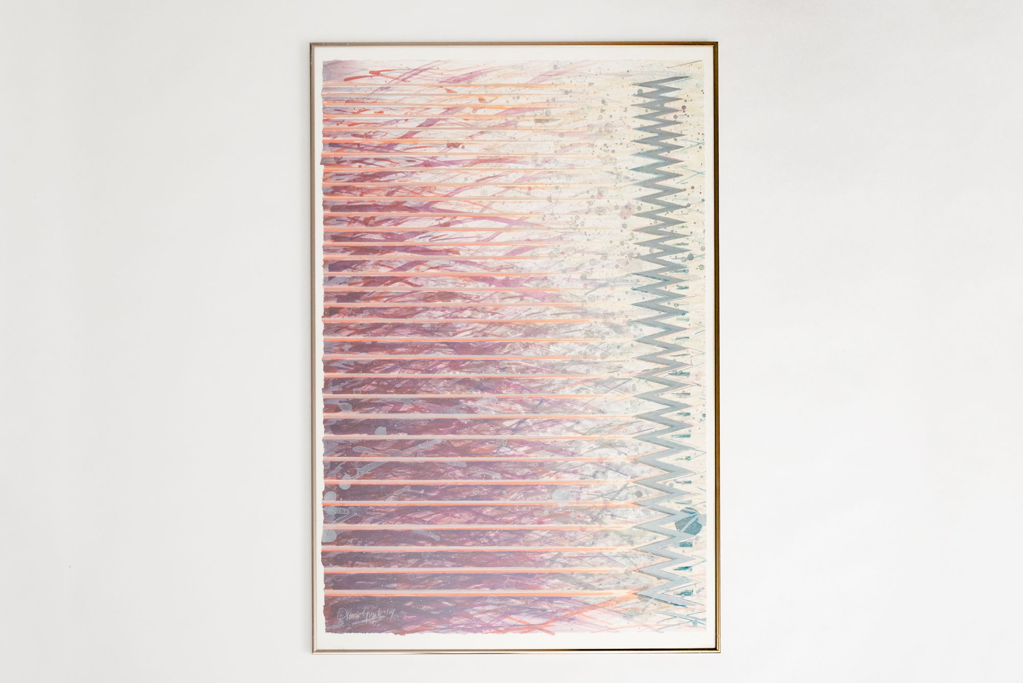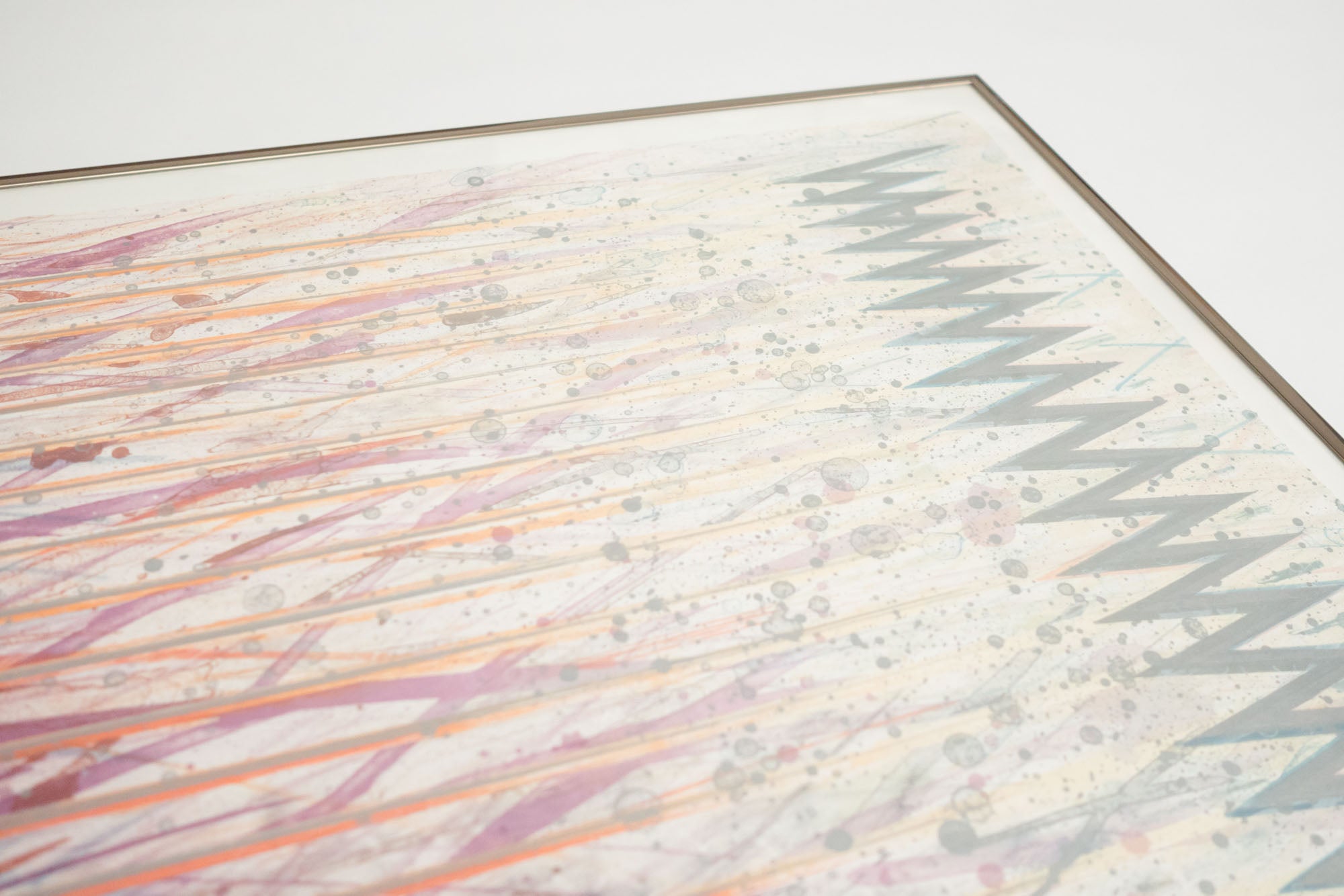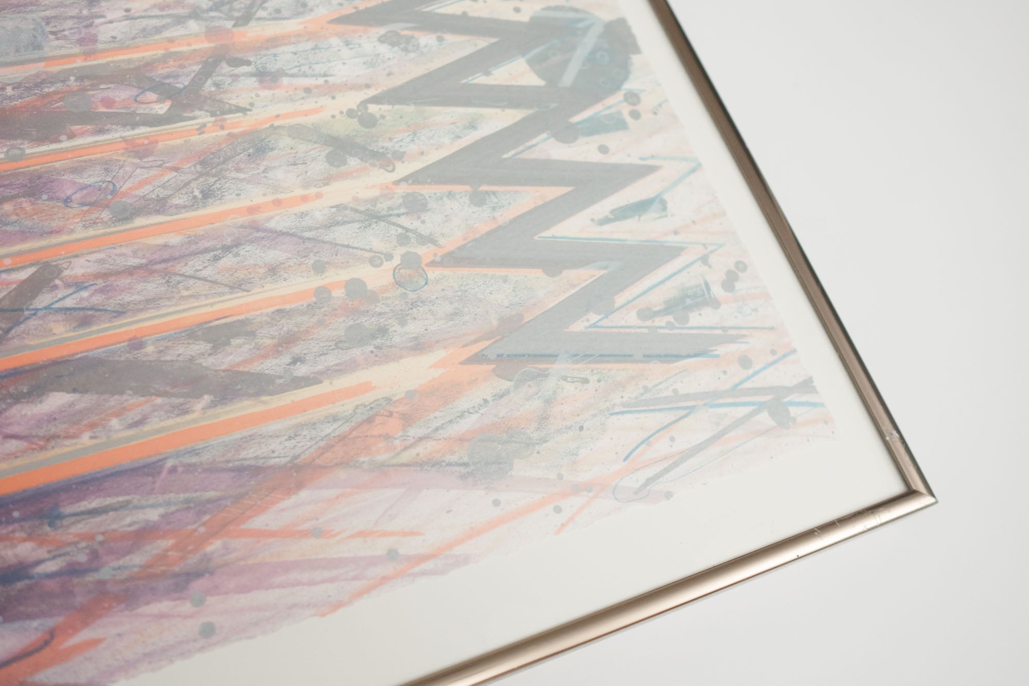 style: original, mod, modern, abstract, print, lines, orange, purplematerial: metal, ink, paper, glasssigned: Karen Guzakage: vintage 1980scondition: good, age related wear - see pictures