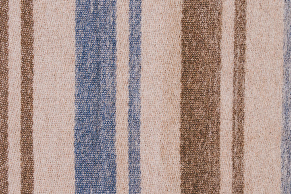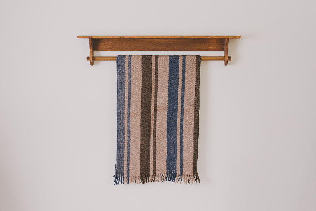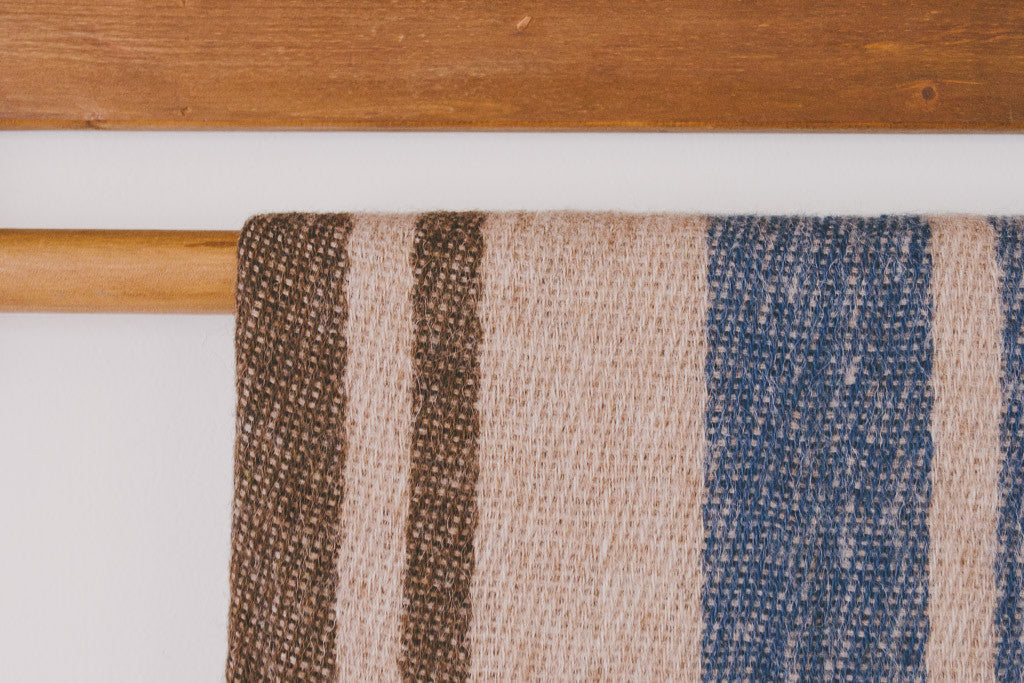 This medium-weight vintage blanket is a brown, blue and cream plaid alpaca wool in excellent shape. Perfect for picnics, camping or thrown over your favorite chair. Please see pictures for detailed condition of this piece.