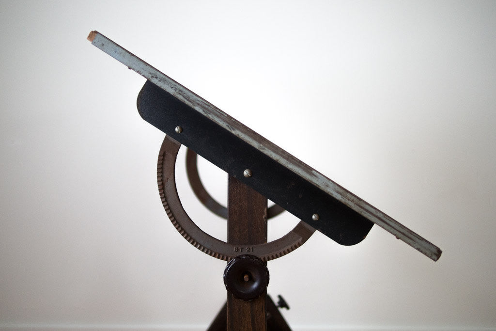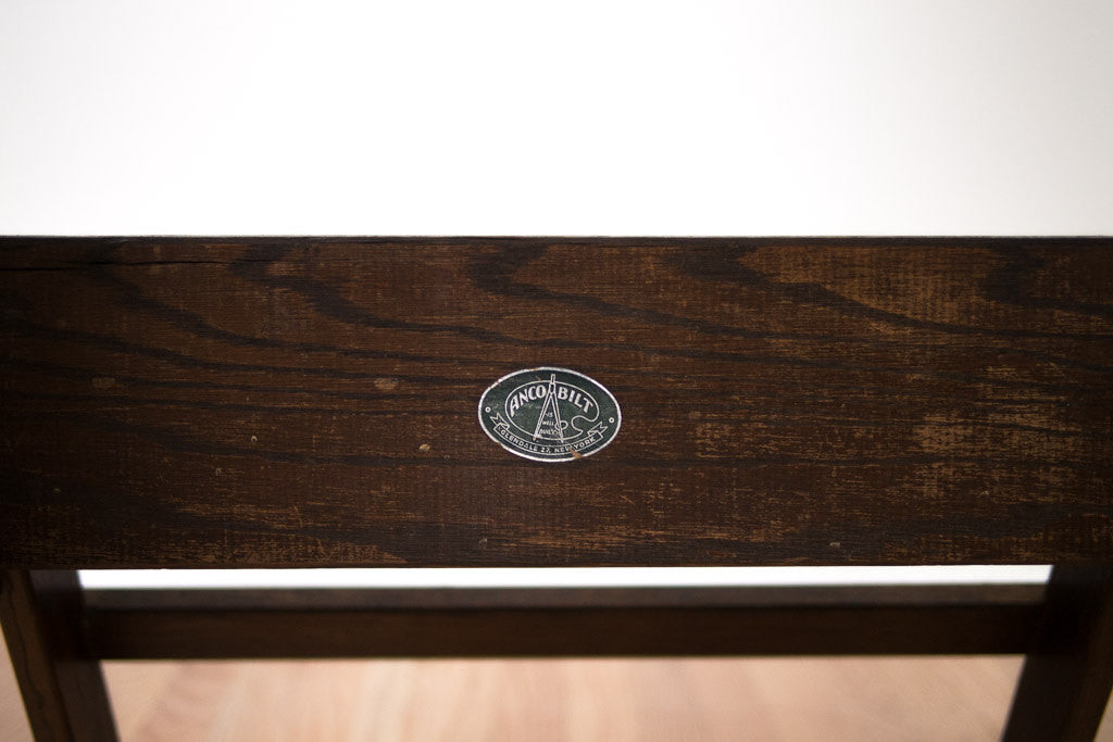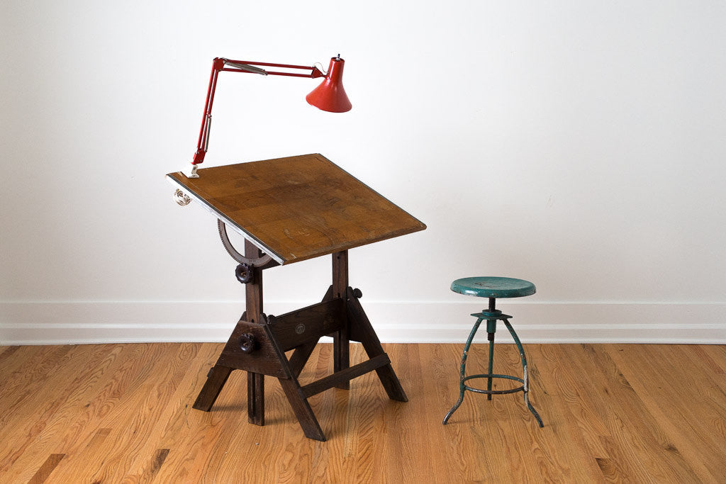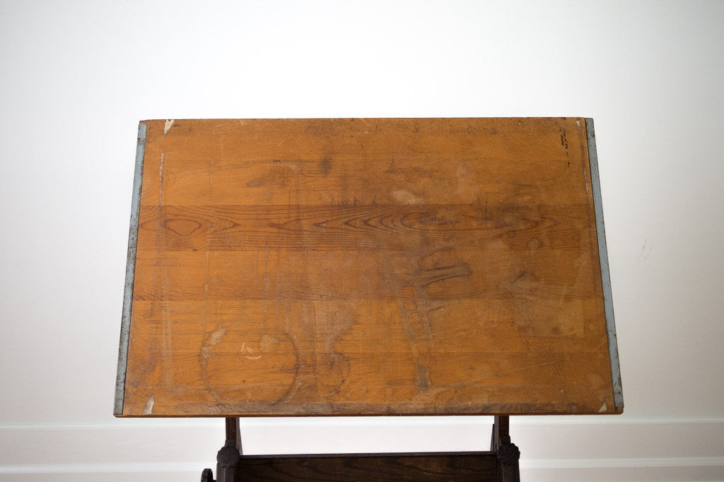 We have an old rustic wood drafting table in the shop. This drafting table was manufactured by Anco Bilt. It has a dark wood base with a slightly lighter distressed wood top. The height and pitch are easily adjustable. This table is sturdy and in overall excellent condition besides the obvious surface wear. It would make a great standing desk.