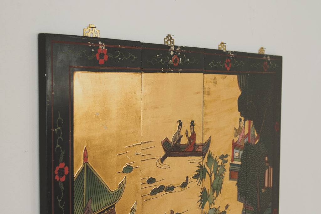 These four vintage painted wood panels make up one large Asian scenery art piece. They have brass hardware and are in good shape with age related wear. Please see pictures for detailed condition.