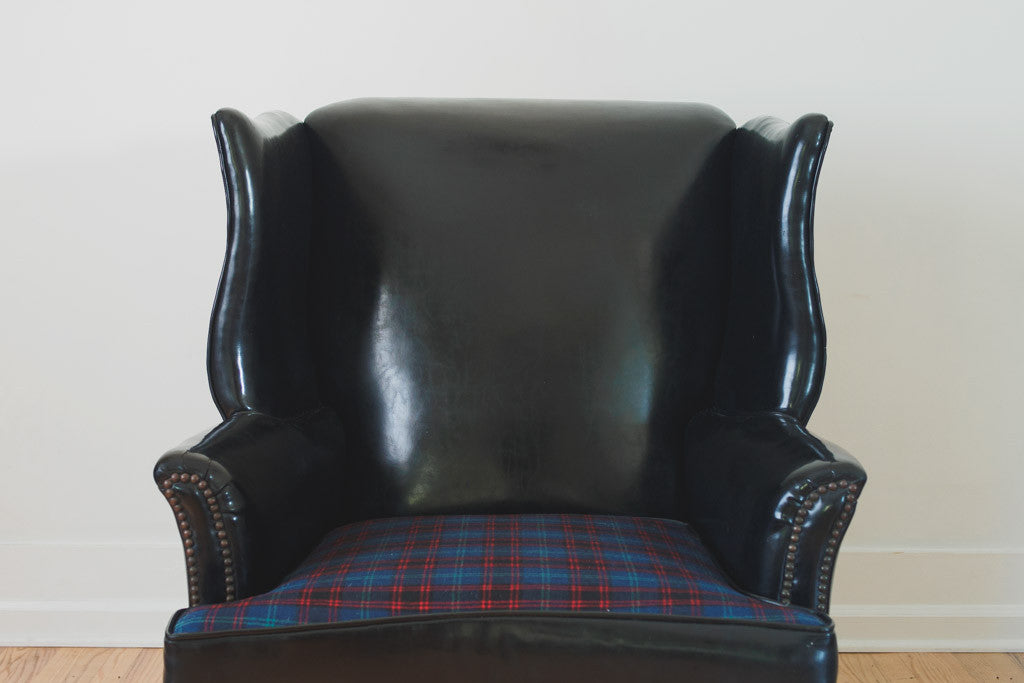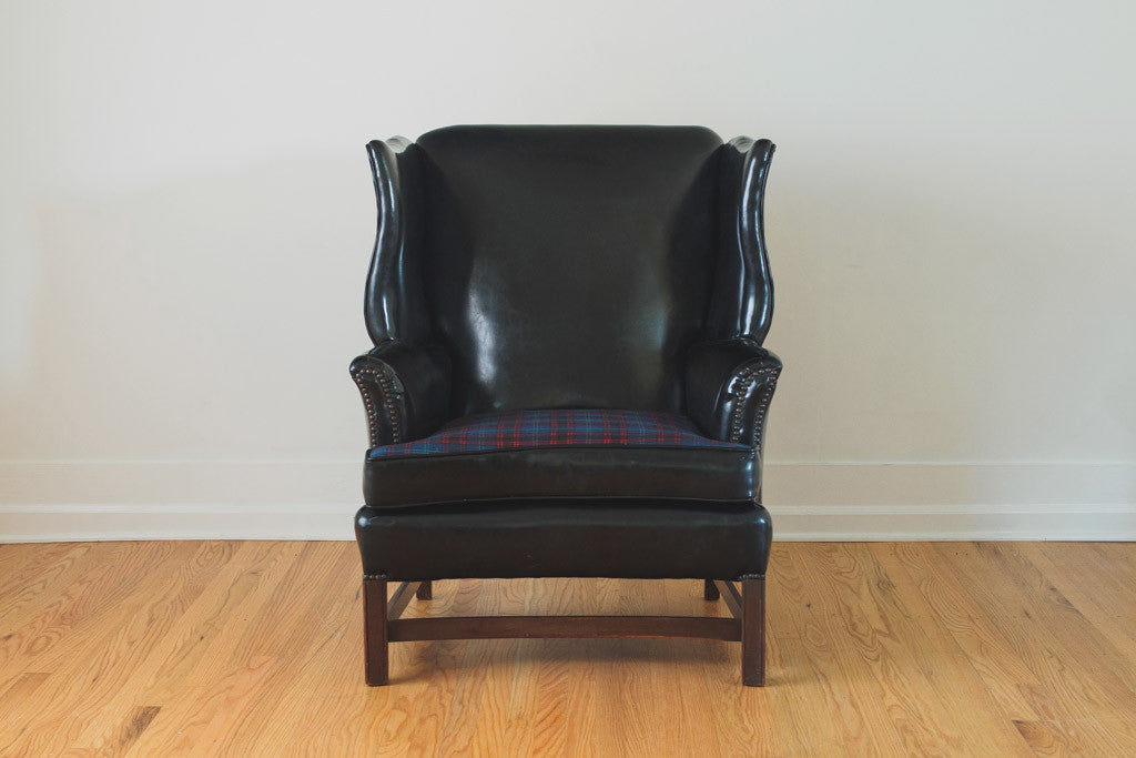 This vintage black naugahyde wingback chair has a detached seat cushion, brass nailhead trim and dark wood legs. It's been internally restored including a new foam cushion with navy, red and black plaid upholstery on the top panel. It's in good shape with age related wear including a few small nicks in the upholstery. Please see pictures for detailed condition.