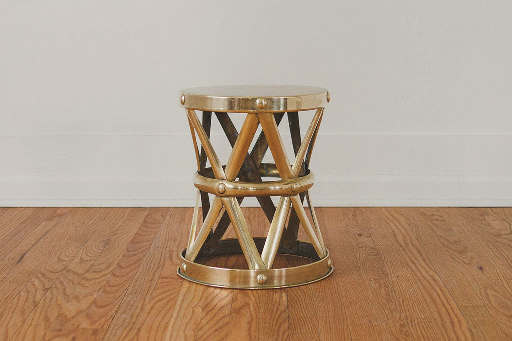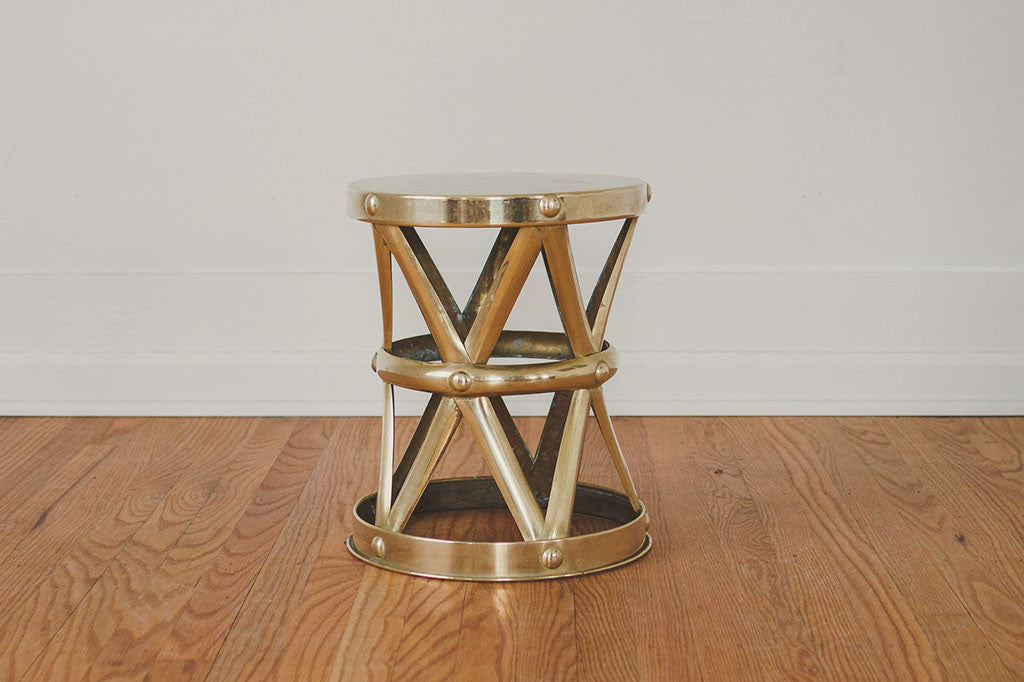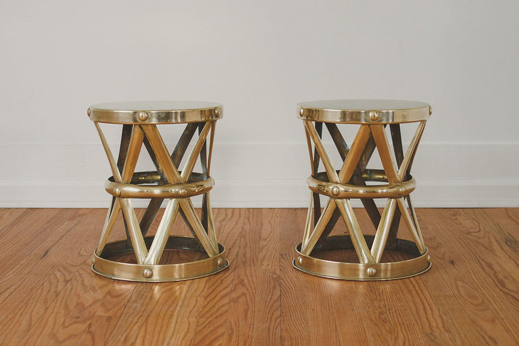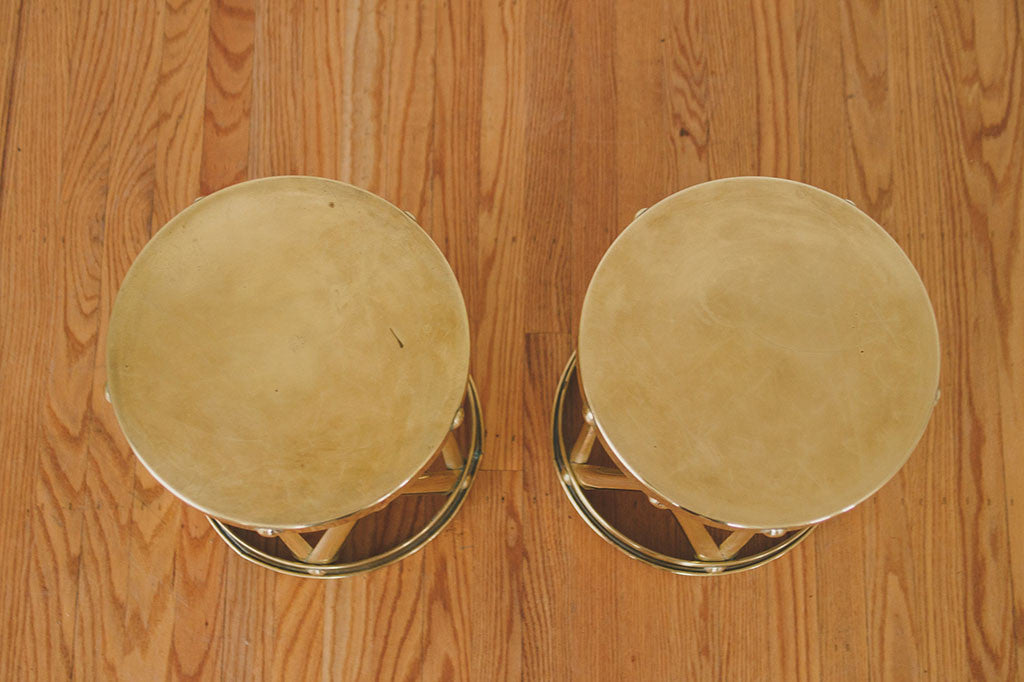 This pair of vintage brass drum-style side tables have gold lattice frames and solid circular tops. They are sturdy enough to be used as stools and would also make nice plants stands. They're in great overall shape with some age related wear. Please see pictures for detailed condition.