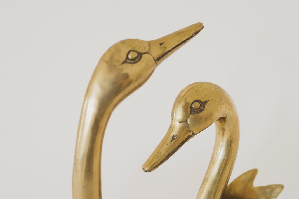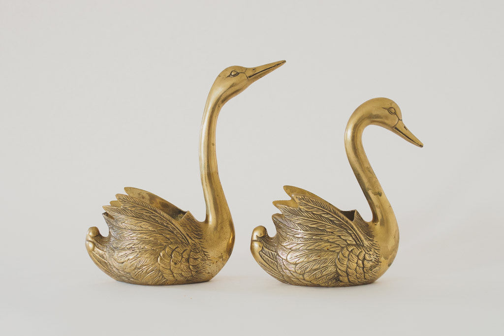 This pair of brass swan planters are in good shape with a nicely aged patina. They could also be used as decorative storage bowls. Please see pictures for detailed condition.