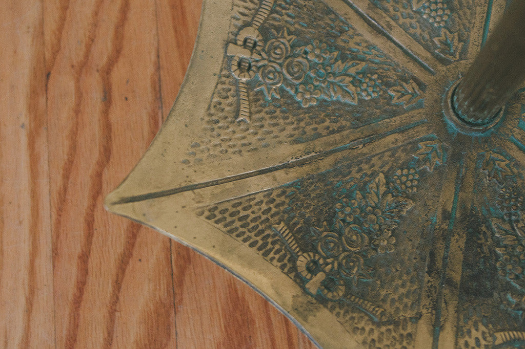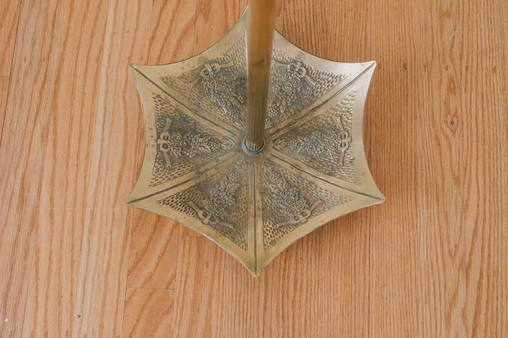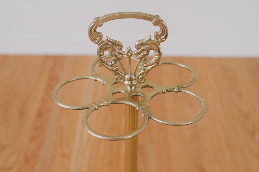 This vintage carved brass umbrella stand holds five umbrellas. It's sturdy with natural age related wear. Please see pictures for detailed condition.