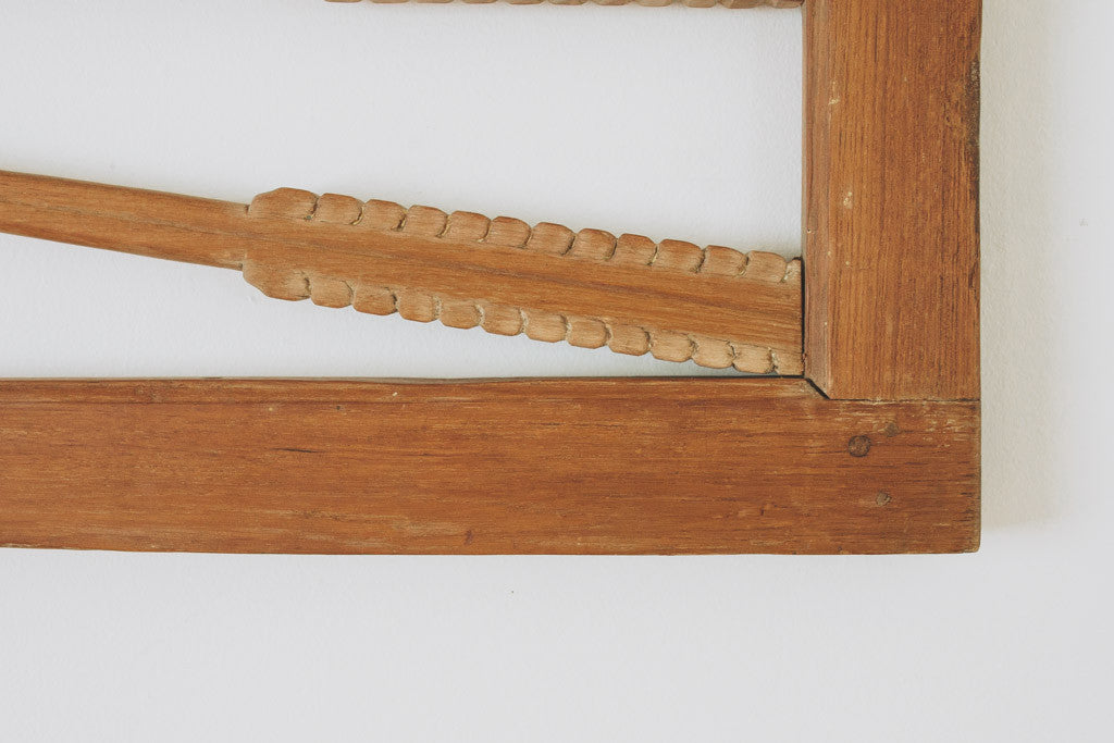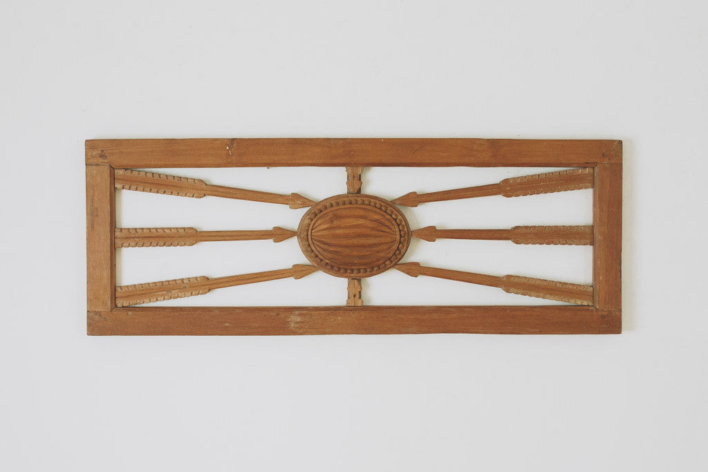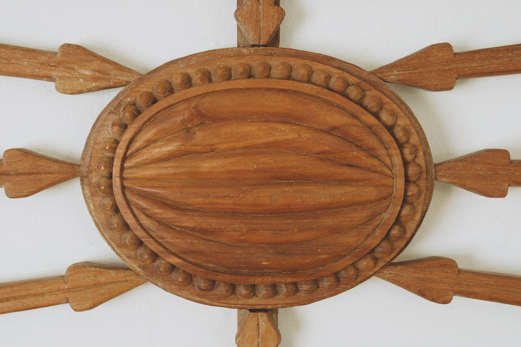 This large vintage wall hanging is solid wood with carved arrows directed towards the center. It's in good shape with age related wear. See pictures for detailed condition.