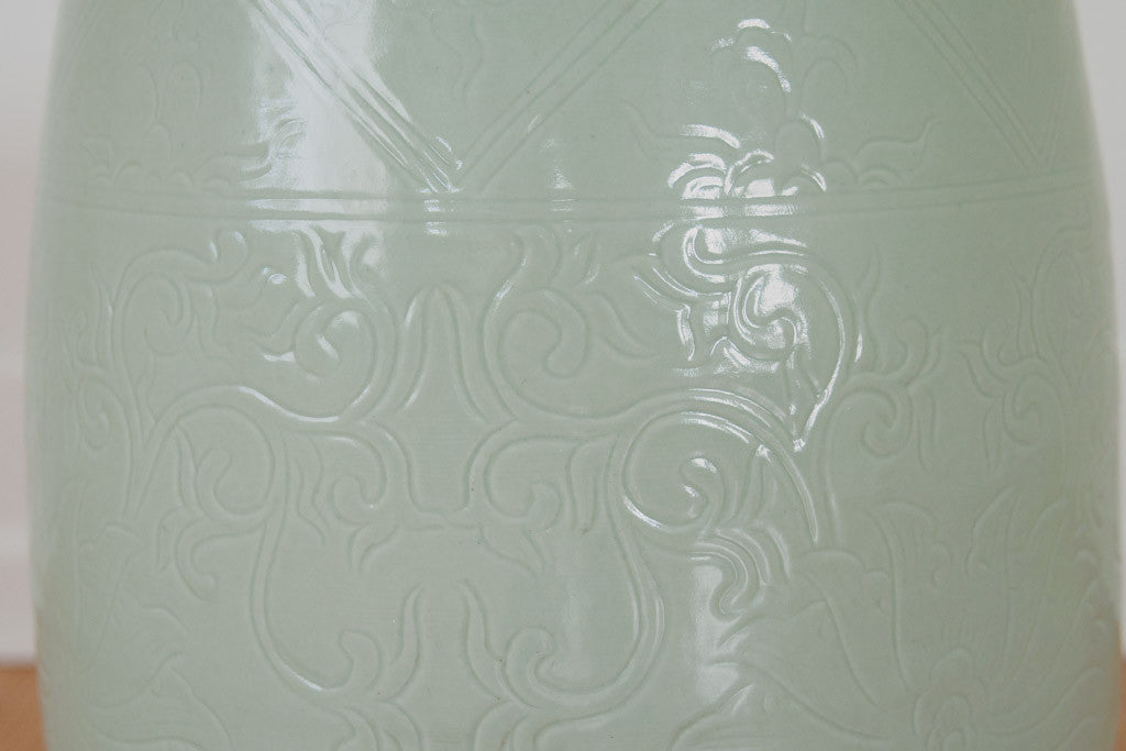 This vintage ceramic stool is light green with carved details. It would also make a great plant stand or side table. It's solid and in excellent shape. Please see pictures for detailed condition.