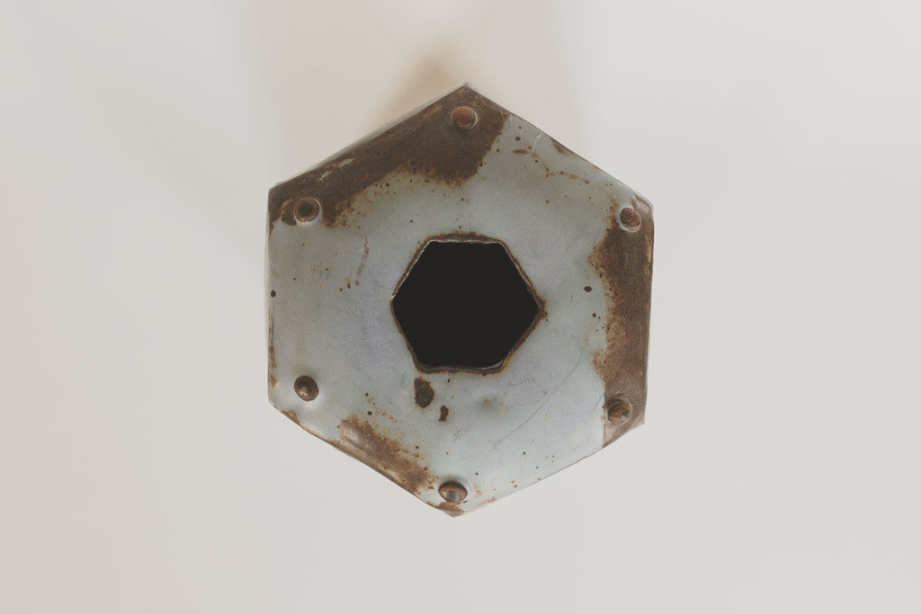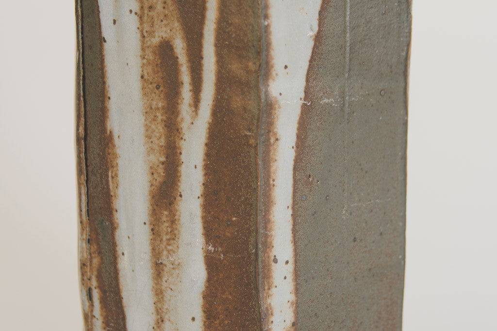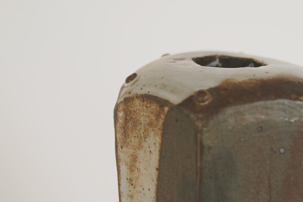 This vintage handcrafted ceramic stonewear vase has shades of grey and blue glaze. Please see pictures for detailed condition.