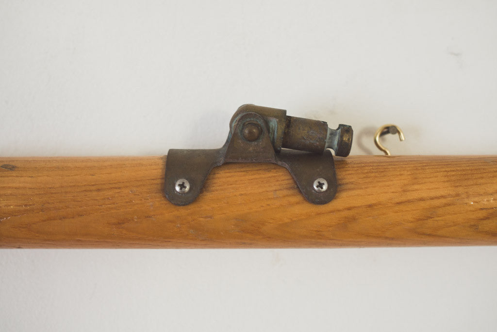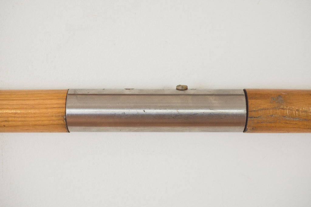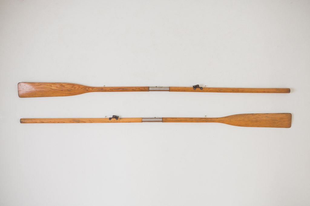 These vintage collapsible oars are oak with metal accents and eye hooks for mounting vertically or horizontally. They're in good shape with age related wear. See pictures for detailed condition.