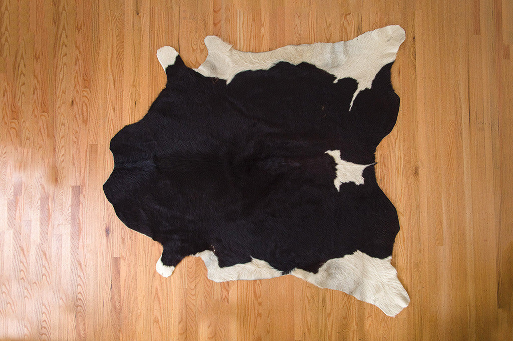This cowhide rug is rich, glossy black with white accents. It’s in great condition with some natural wear. It would work well with a variety of decorating styles. Please see pictures for detailed condition.