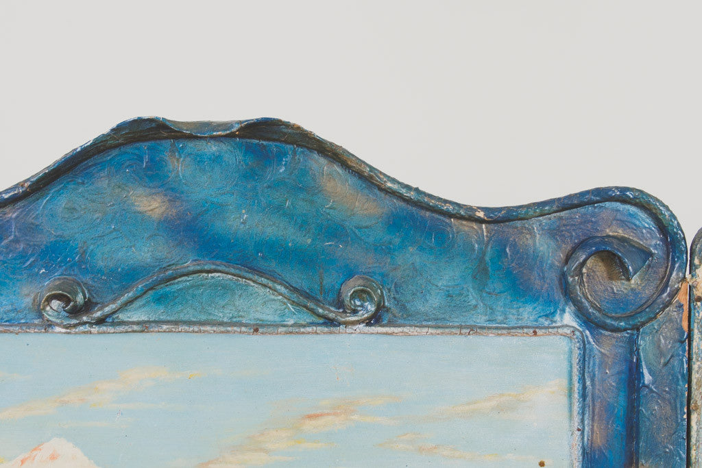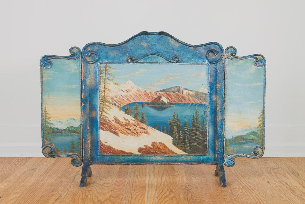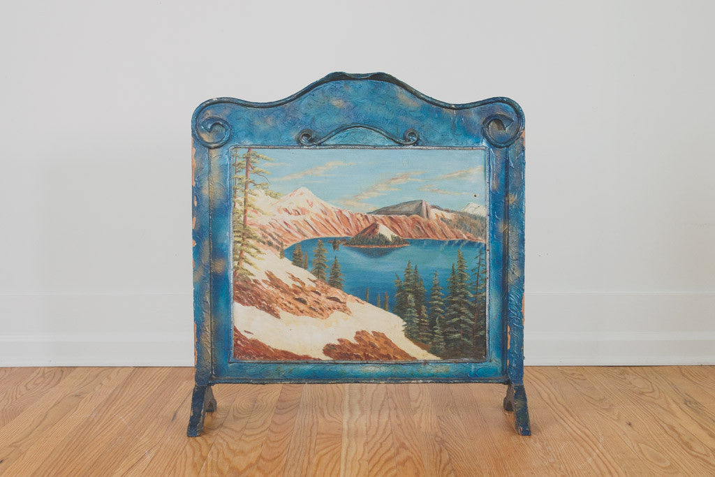 This vintage fireplace screen is blue-painted wood with three landscape screens depicting Crater Lake in Oregon. It's in good distressed shape with age related wear. Please see pictures for detailed condition.