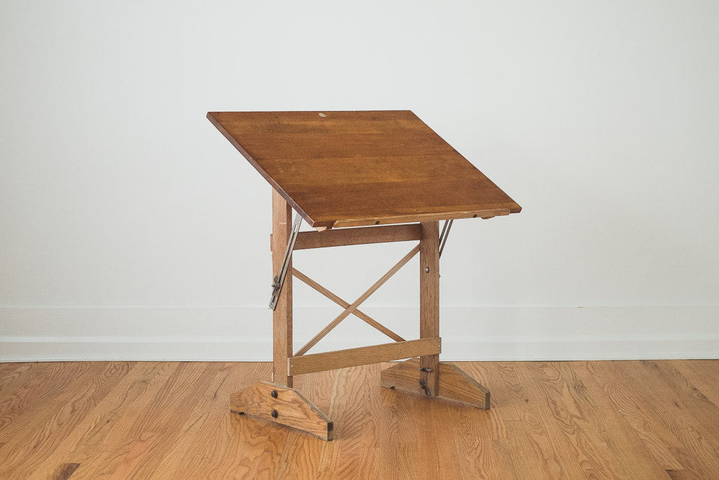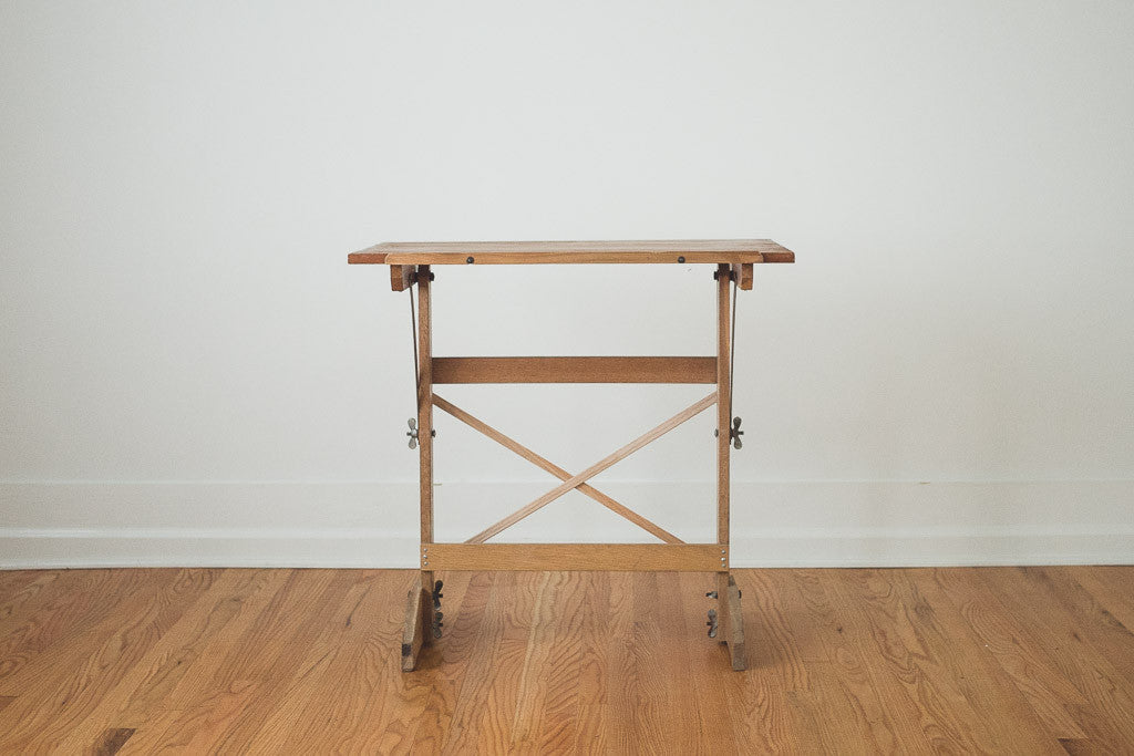 This vintage hand crafted drafting table has metal hardware and is adjustable in pitch. It's in good shape with age related wear. It would make a great standing or seated desk and because of its height and size it could also be used as a kitchen island or bar table. See pictures for detailed condition.