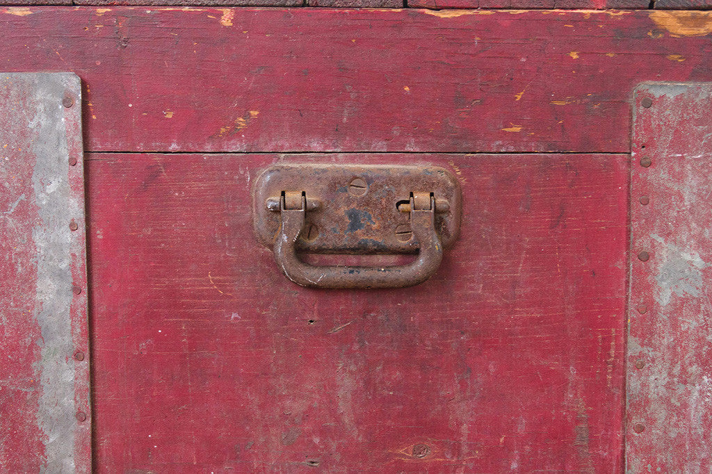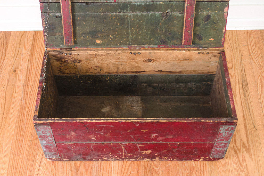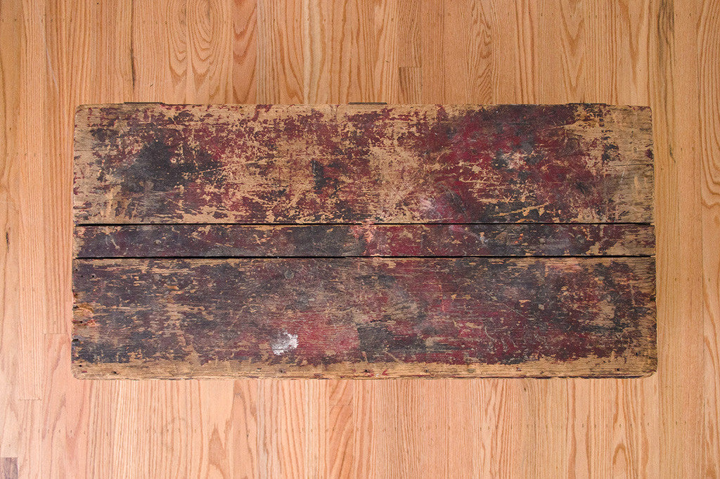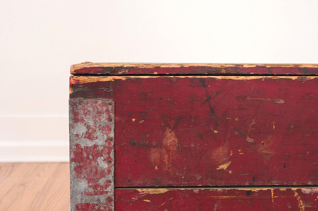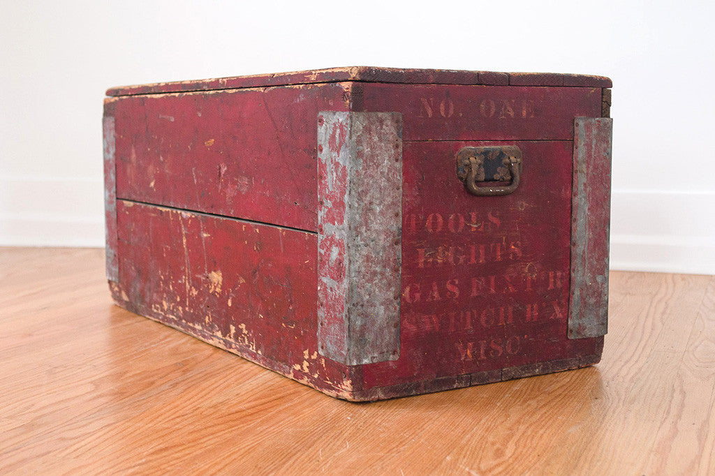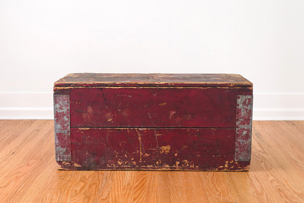 This old wood tool chest has a nicely distressed patina and rustic metal hardware.The metal corner brackets and writing on the side really make this piece standout from other trunks. It's in good functioning shape and would make a great coffee table, end of the bed storage piece or bench. Please see pictures for detailed condition of this piece.