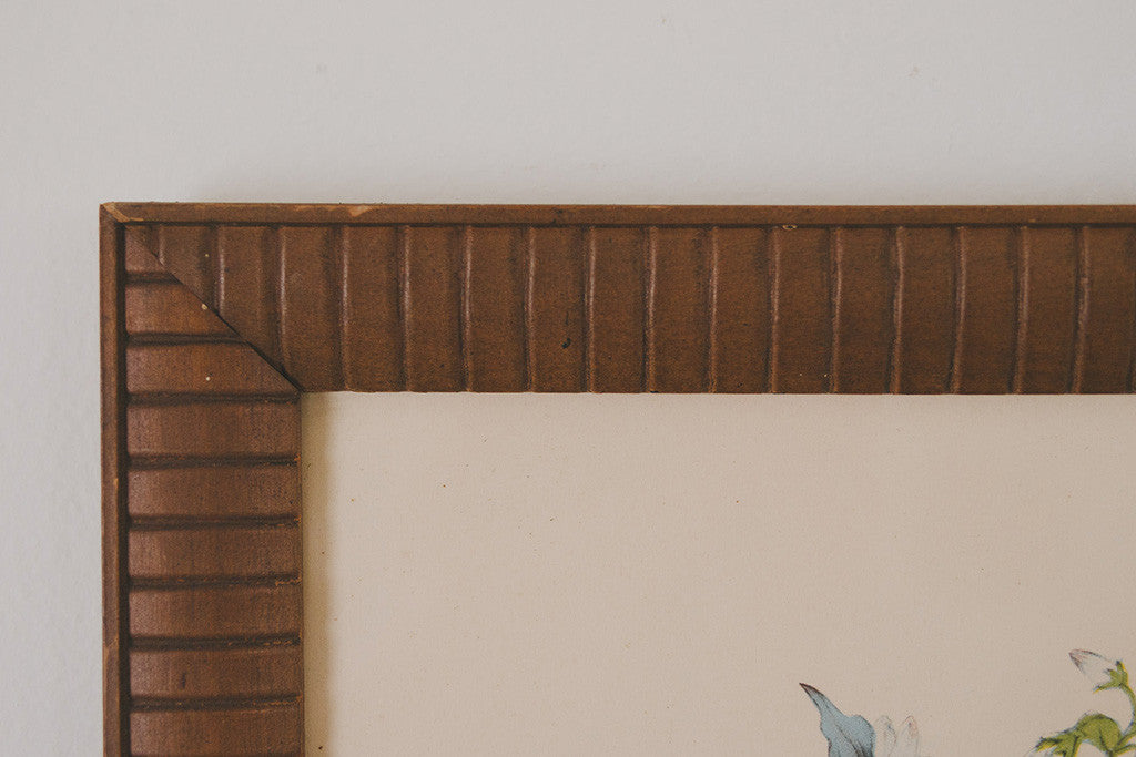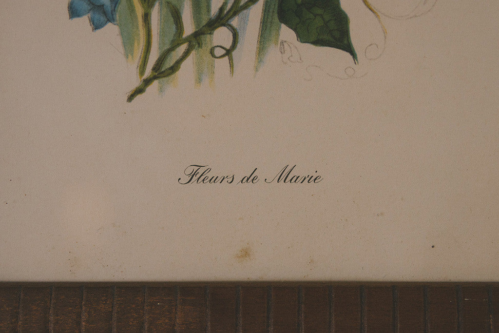 This vintage botanical print is titled, "Fleurs de Marie" and features white, blue, red, orange and yellow flowers with green accents. The wood frame and print have age related wear and the glass is in good shape. Please see pictures for detailed condition.
