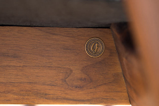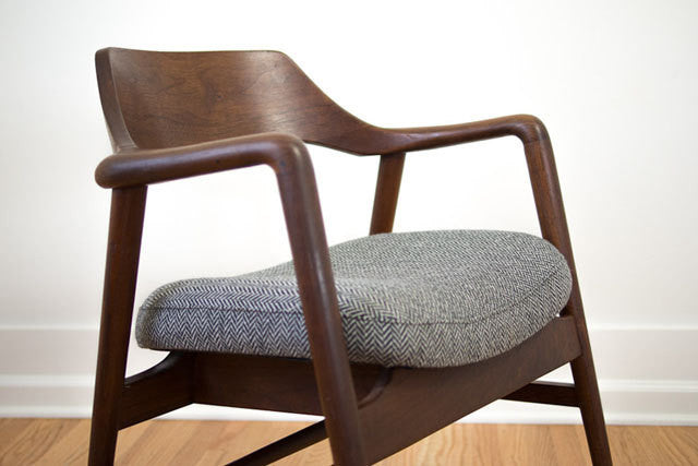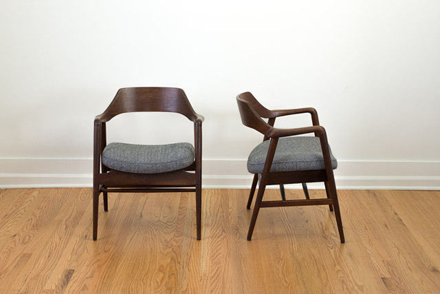 We had this handsome set of Mid Century Gunlocke wood arm chairs reupholstered in a vintage black and white herringbone wool fabric. They have a floating seat with a dark wood frame, curved backrest and dowel detail below the seat. They're sturdy and the curved back design makes them very comfortable.