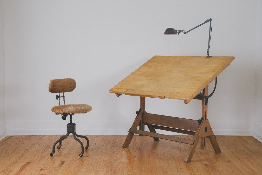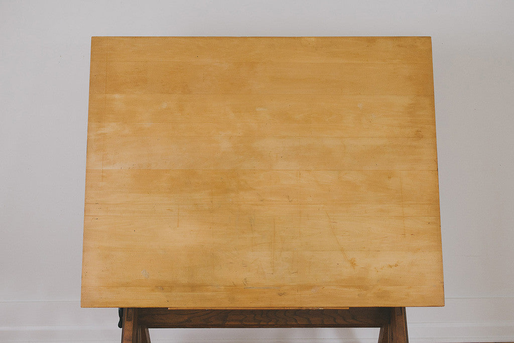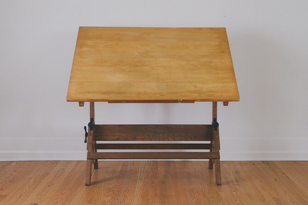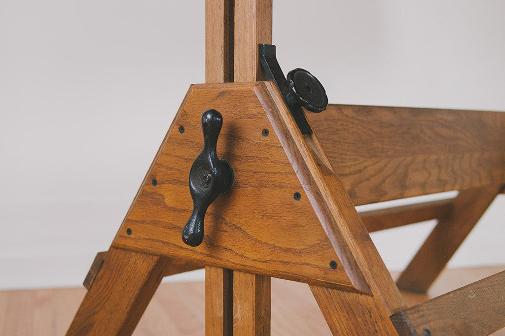 This vintage drafting table is a larger model manufactured by Hamilton in Two Rivers, Wisconsin. It's solid oak with cast iron hardware and is adjustable in height and pitch. This table is sturdy and in overall great shape with some age related wear. It could be used as a standing or seated desk and because of its height and size, could also be used as a dining table, kitchen island or bar table. Please see pictures for detailed condition.