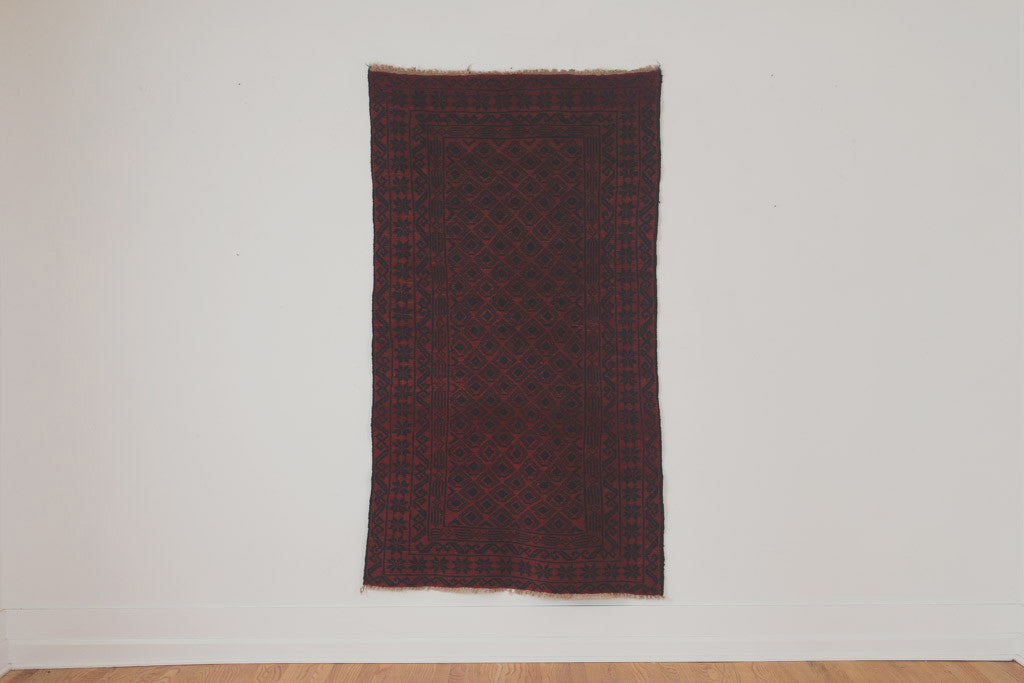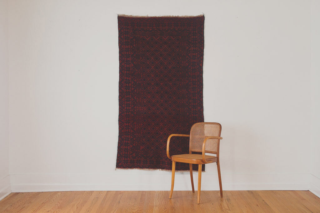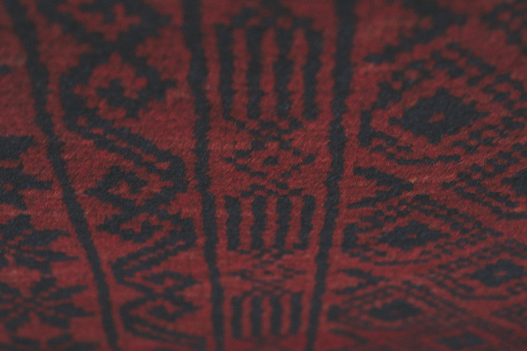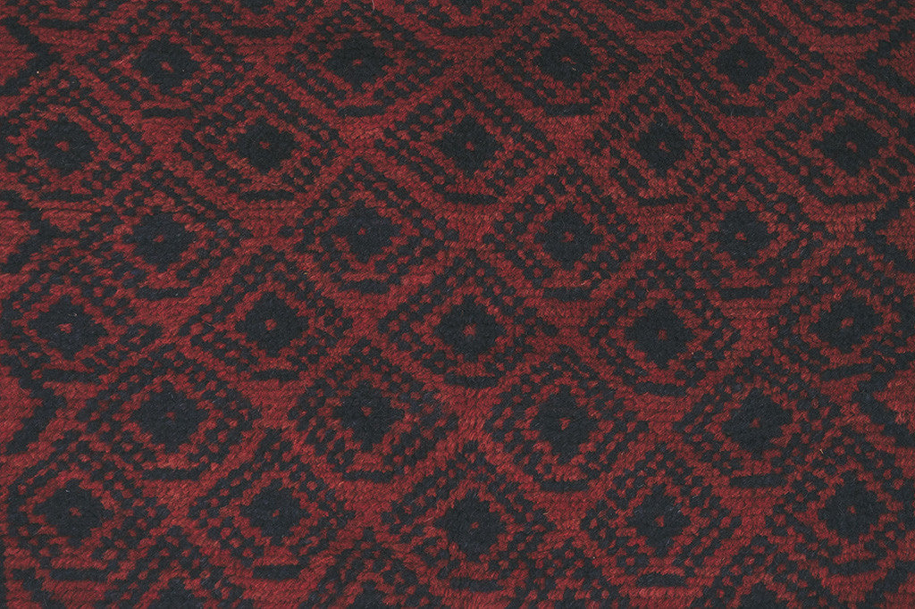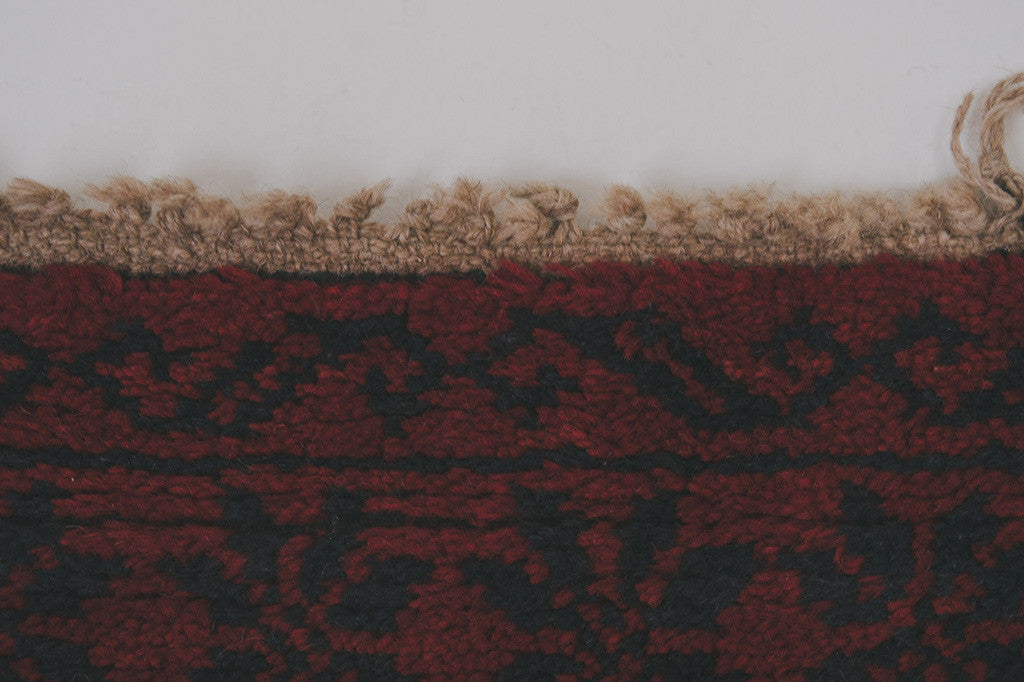 This large hand knotted wool rug is from Afghanistan. It has a dark red base with navy accents and cream fringe. It's in great shape with age related wear. Please see pictures for detailed condition.