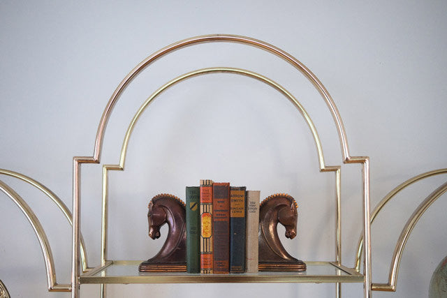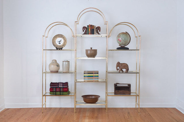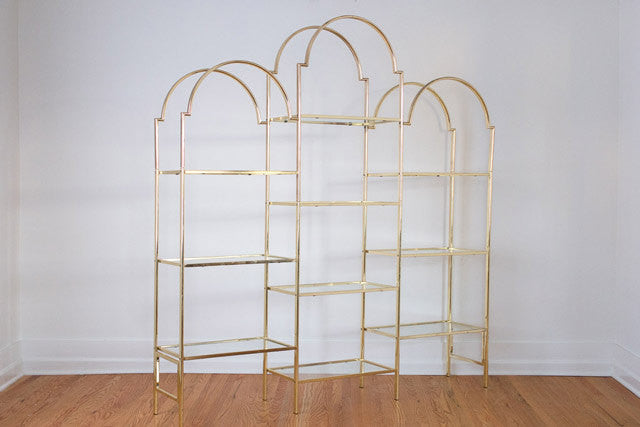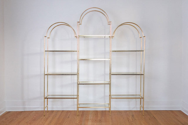 We love this vintage gold Hollywood Regency style bookcase. It has ten glass shelves in three sections each topped with an arch. It's in overall great shape with some light surface wear. It can break down into smaller pieces for easier transport or shipping.