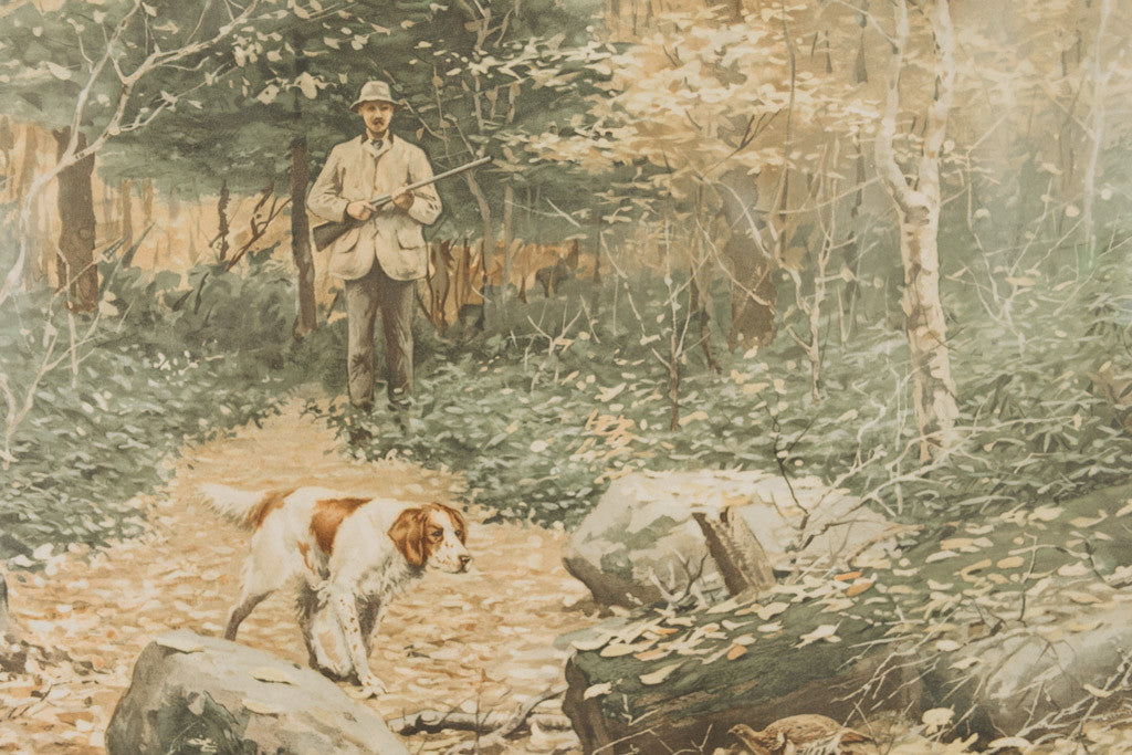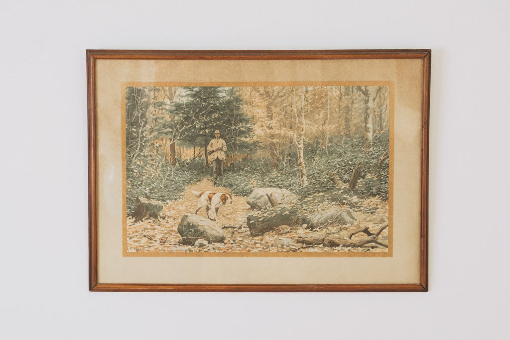 This vintage framed print features a hunting scene with a man and his dog in the forest. It's in great shape with age related wear. See pictures for detailed condition.