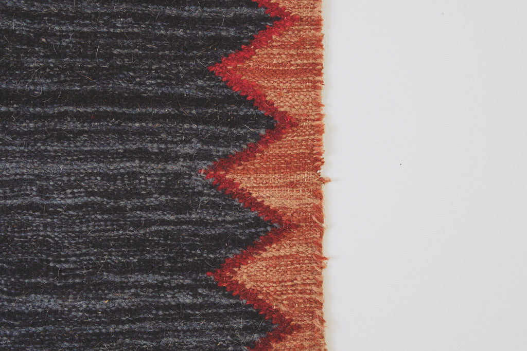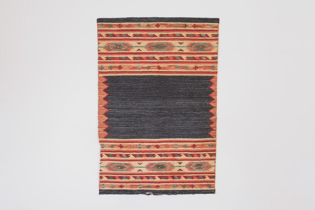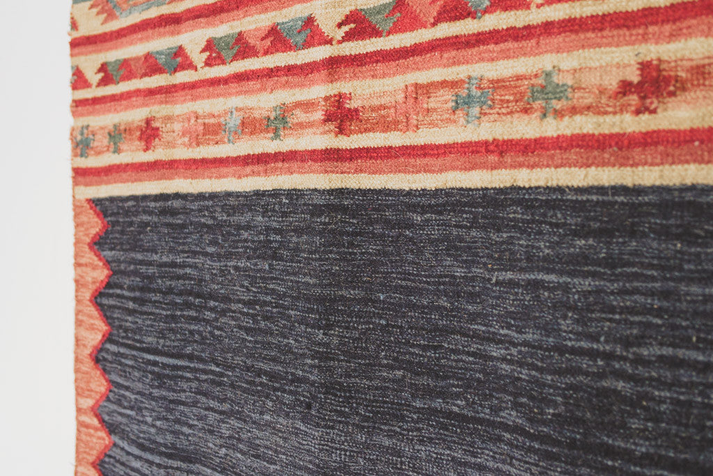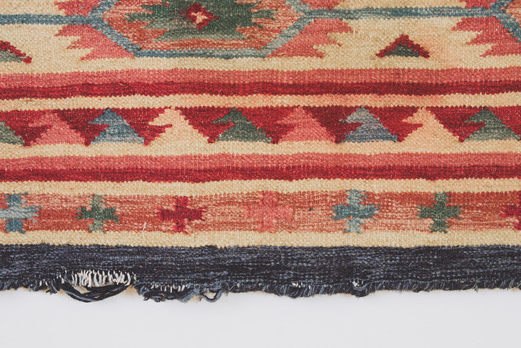 This vintage hand woven kilim rug has a navy base with a dark and light pink geometric pattern. It's in good shape with age related fraying and wear. It was just professionally cleaned. See pictures for detailed condition.