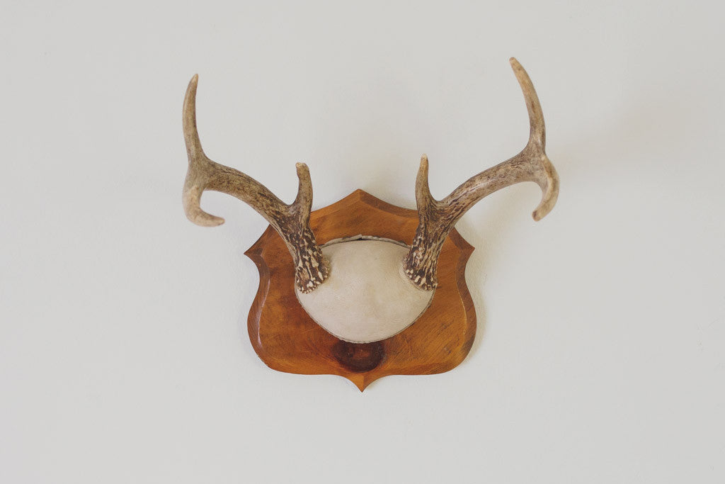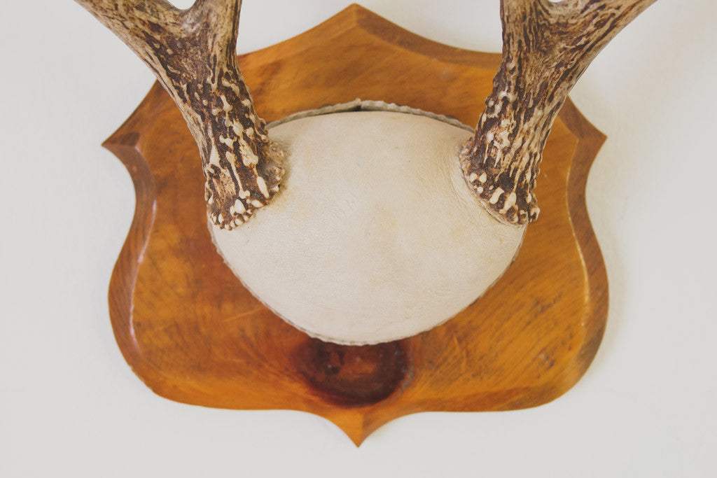 These vintage deer antlers are a smaller six-point size. They're mounted on a cedar wood plaque with rawhide leather upholstery. They are in great shape with some age related wear. Please see pictures for detailed condition.
