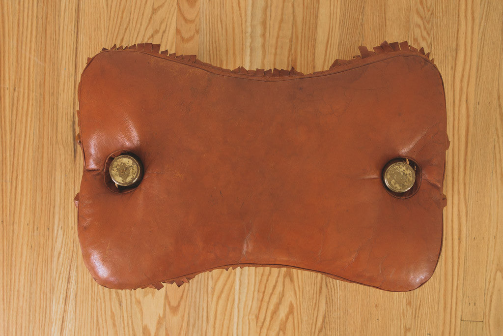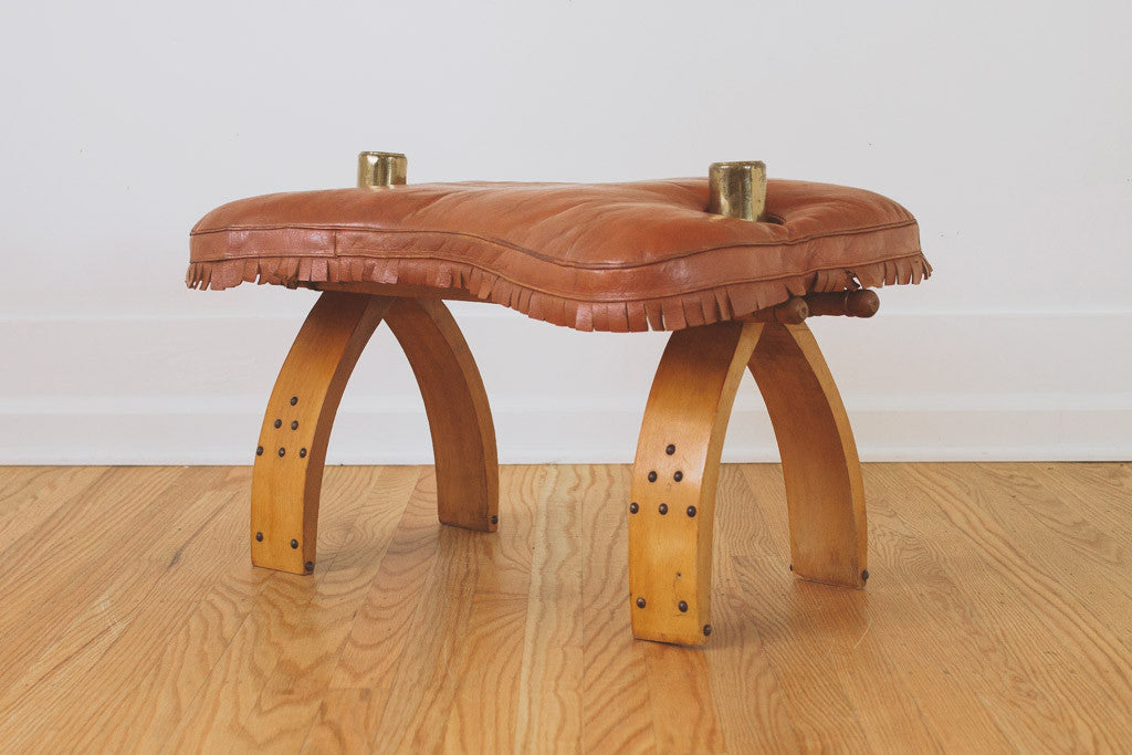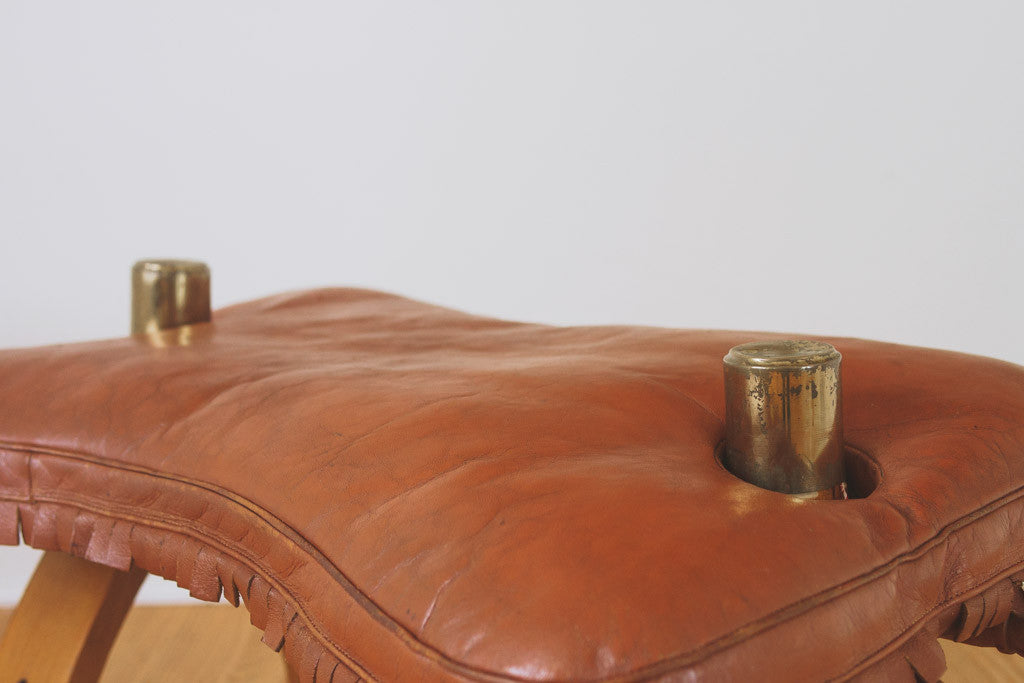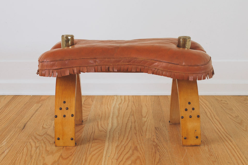 This vintage larger sized camel saddle stool has a detachable leather cushion, sturdy wood frame and brass accents. It would make a great ottoman or bench. It's in good shape with age related wear. See pictures for detailed condition.