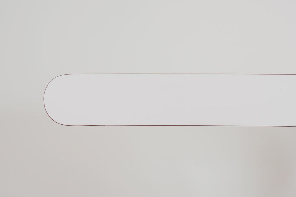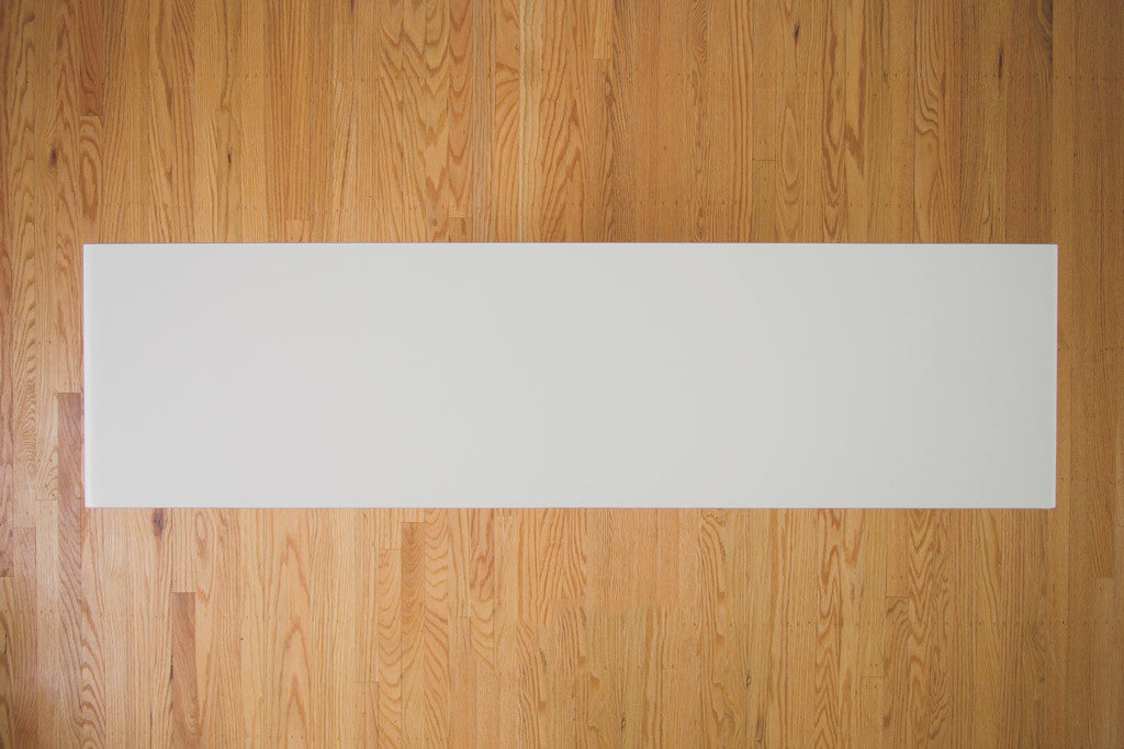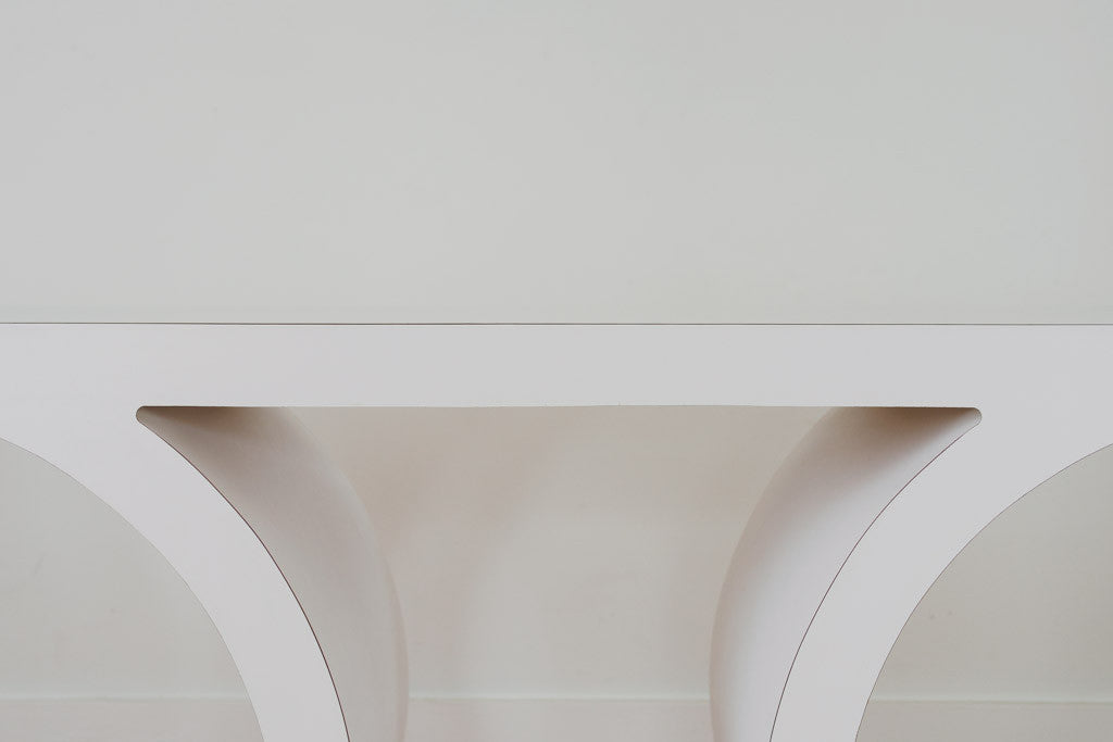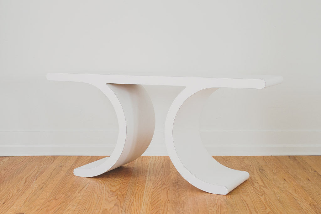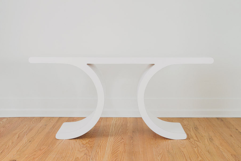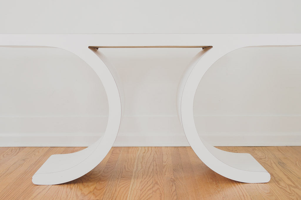 This vintage Karl Springer style modern console table is a white solid surface with a curved base. It would be perfect behind a sofa or used as a bar, entry table or credenza. It's in good shape with light age related wear. Please see pictures for detailed condition.