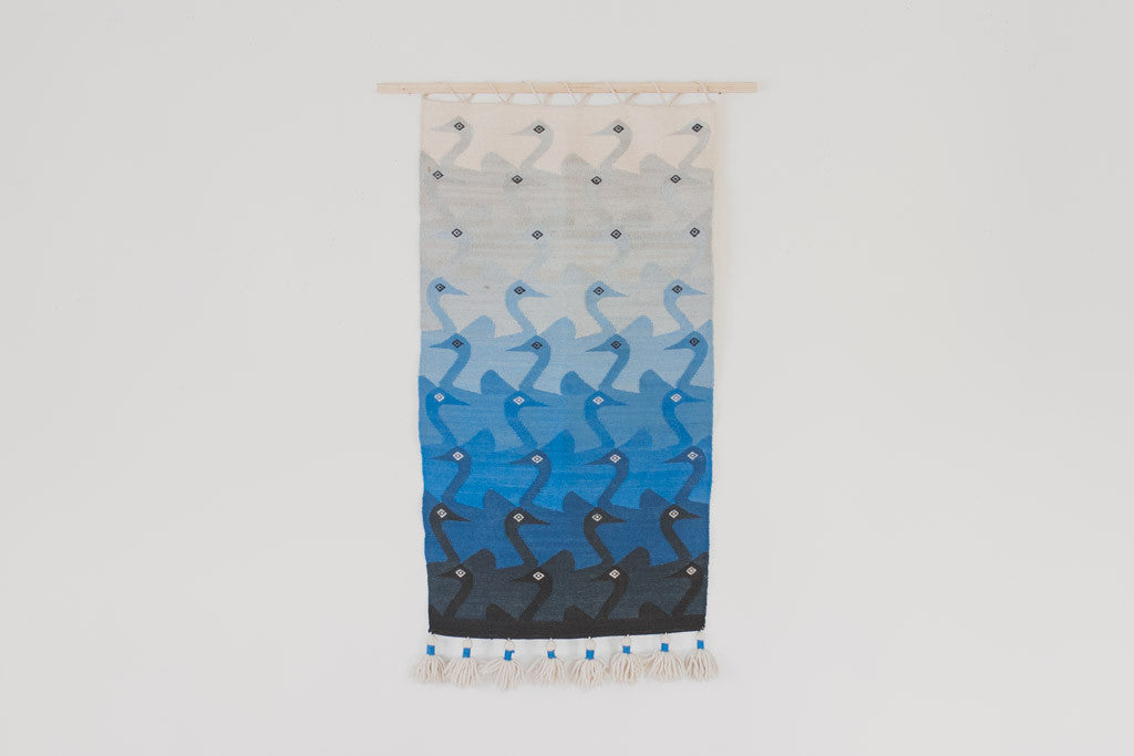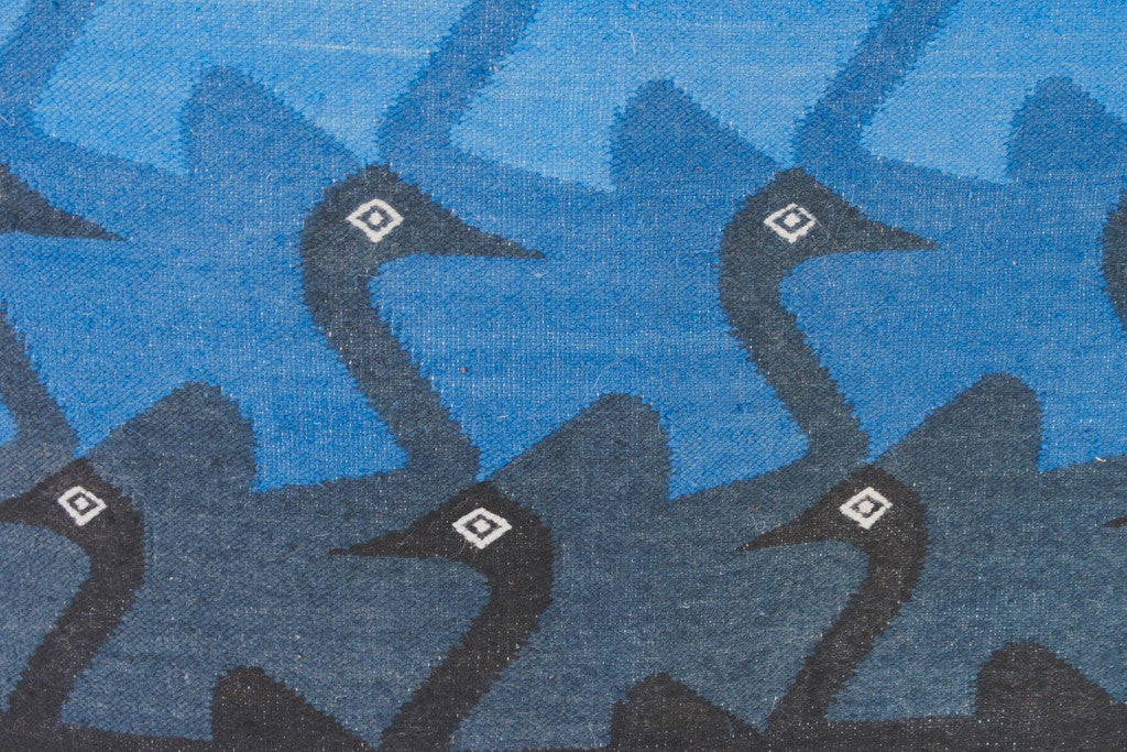 This Mid Century handwoven wool tapestry has a cream, grey, blue and black bird design, cream tassels on the bottom and a natural wood display dowel. It's in good shape with natural age related wear. Please see pictures for detailed condition.