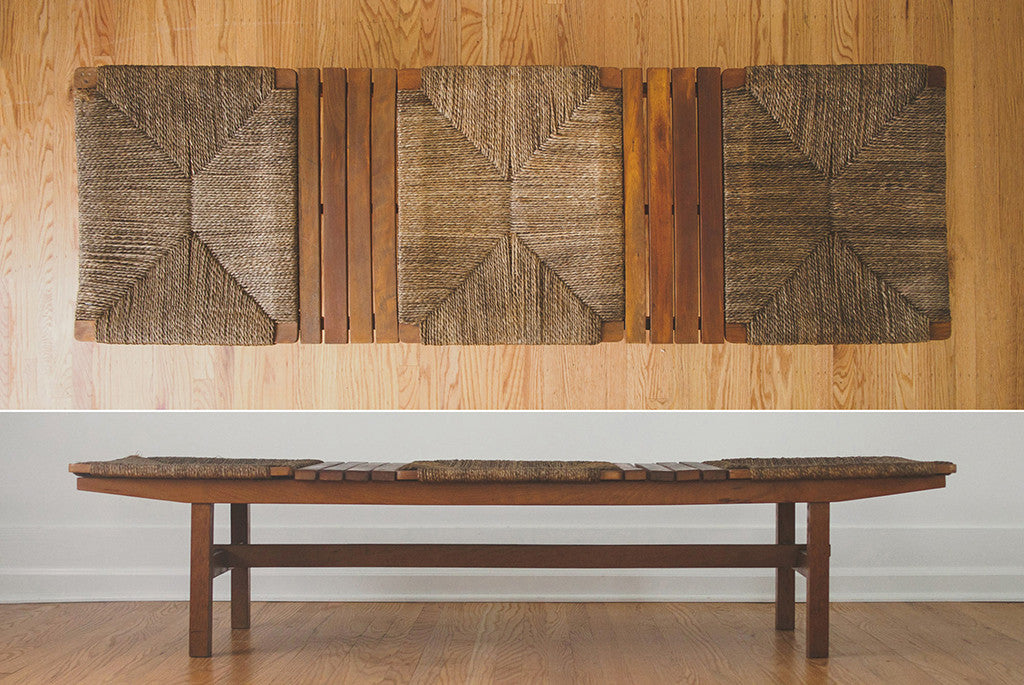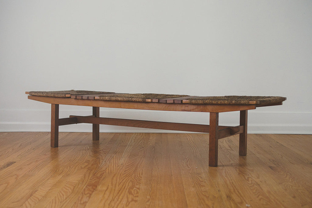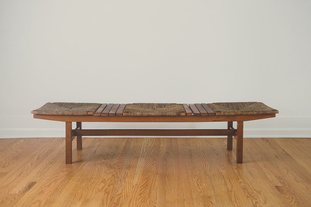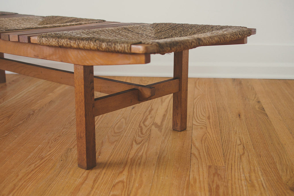 This Mid Century woven jute and slat bench was manufactured by AFM Quality Furniture in Japan. It has two sets of solid wood slats between three woven jute seats. It's in good overall shape with age related wear. Please see pictures for detailed condition.