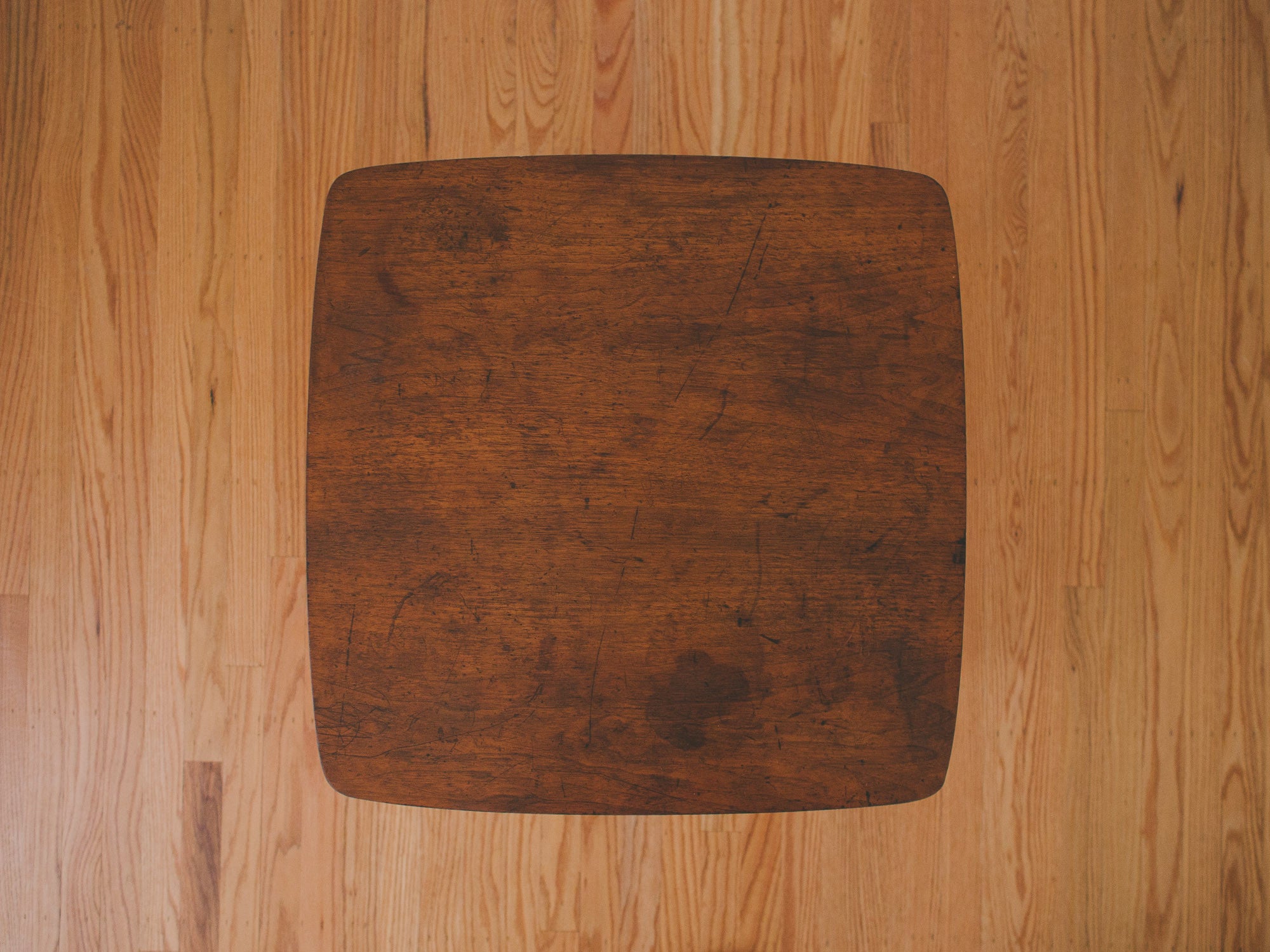 This vintage Mid Century side table has a solid walnut frame. It's sturdy and in good overall shape with a distressed top. It could also be used as a coffee table in a smaller space. Please see pictures for detailed condition.