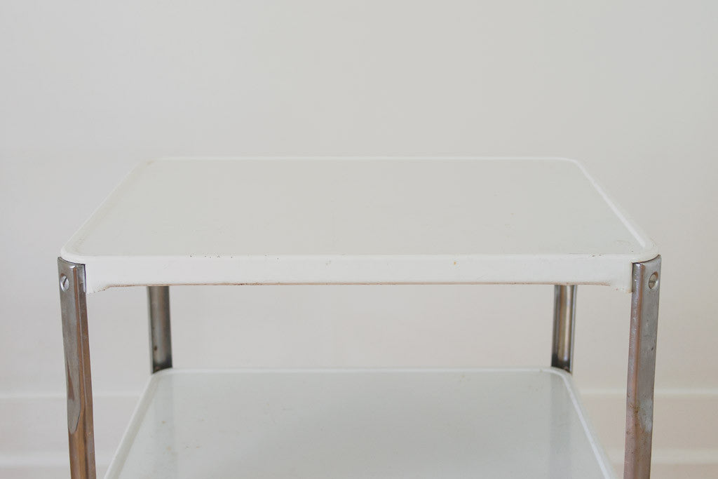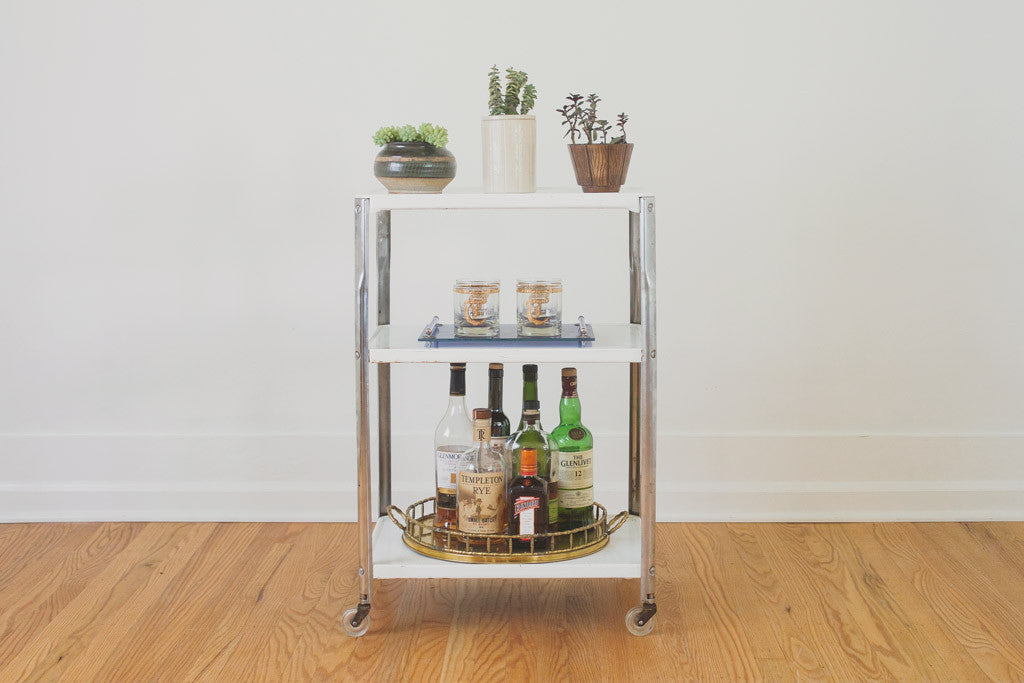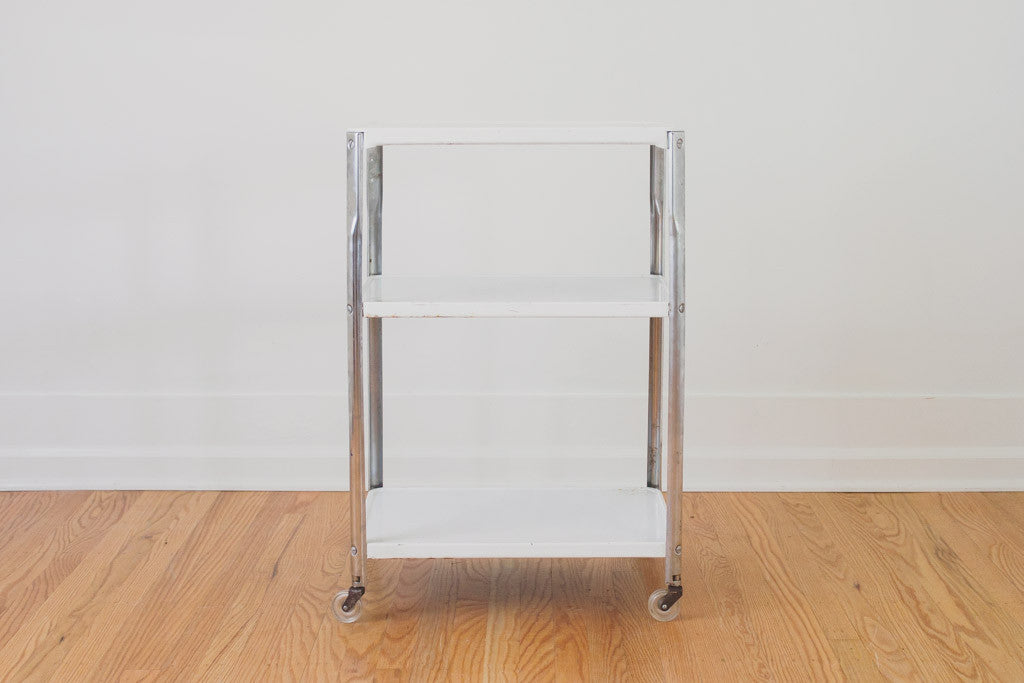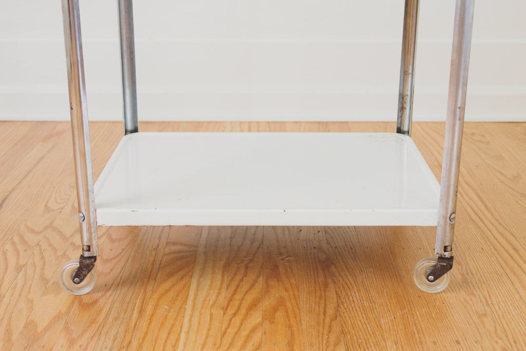 This industrial bar cart has a steel frame with three white shelves and clear wheels. It's in good shape with age related wear. Please see pictures for detailed condition.