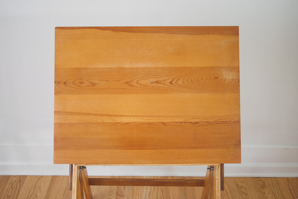 This vintage drafting table is oak with metal hardware and is adjustable in height and pitch. It's sturdy and in good shape with age related wear. It could be used as a standing or seated desk, bar, island or kitchen table. Please see pictures for detailed condition.