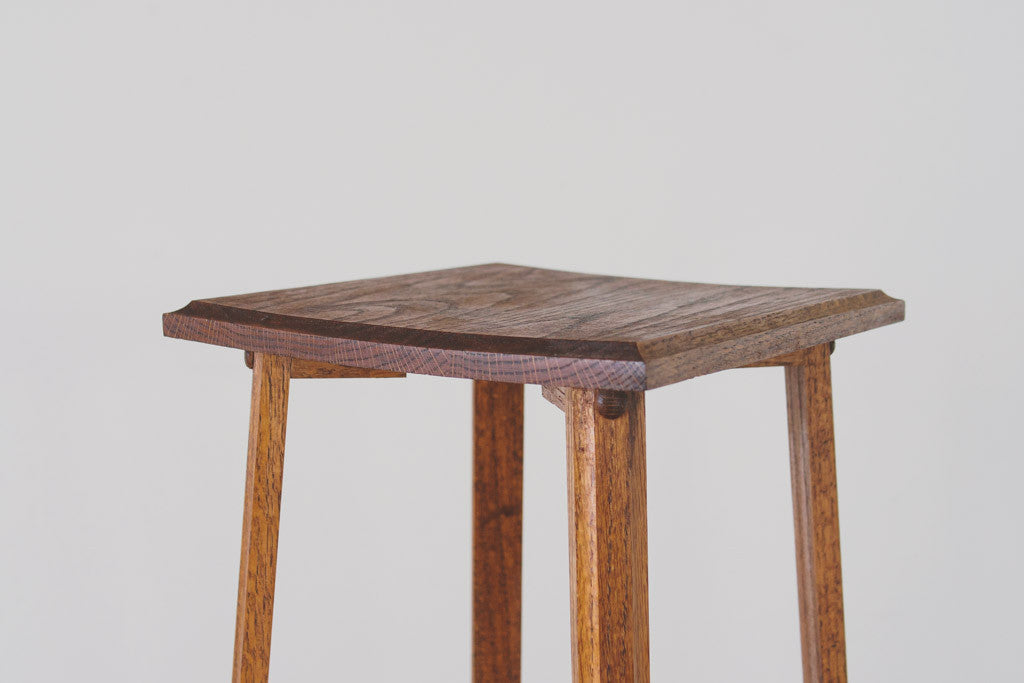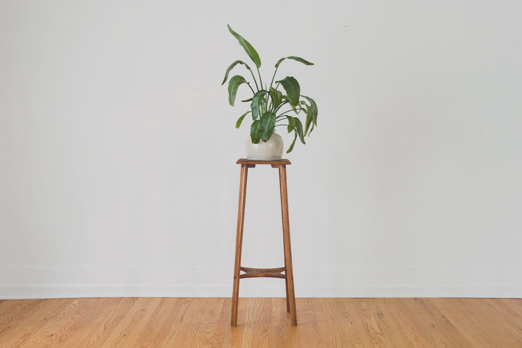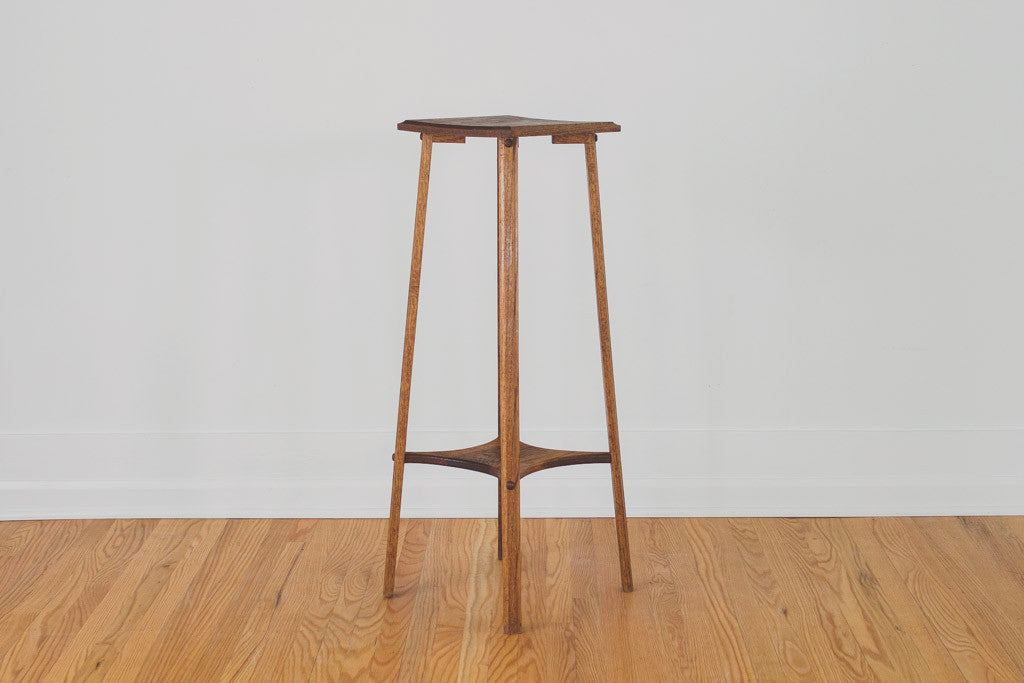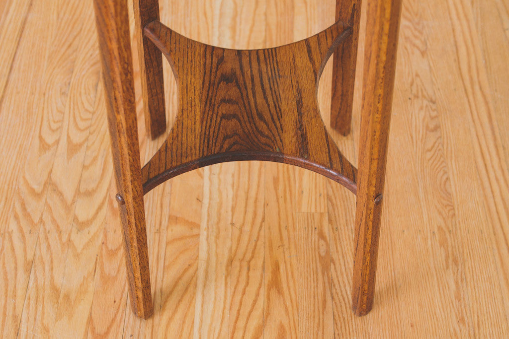 This tall vintage oak plant stand has two shelves. It's sturdy and in great shape with some light age related wear. Please see pictures for detailed condition.