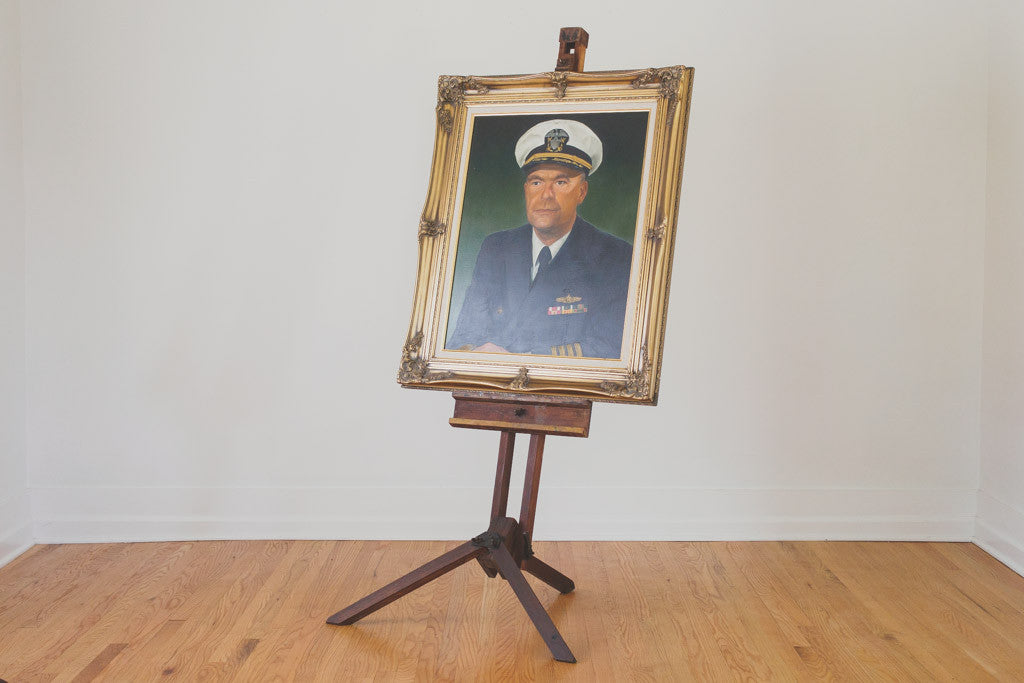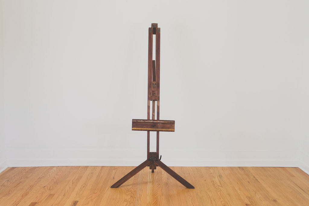 This large vintage wood easel is oak with metal hardware and a tripod base. It adjusts easily, is sturdy and in overall good shape. It's perfect for displaying large pieces of art, maps or could be modified to hold a flat screen TV. Please see pictures for detailed condition.