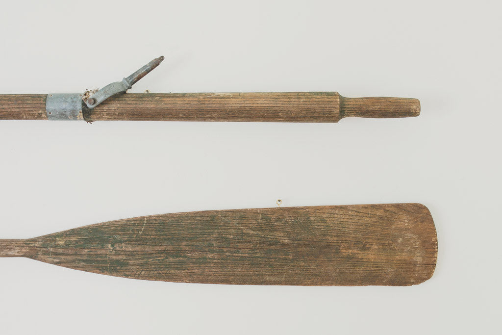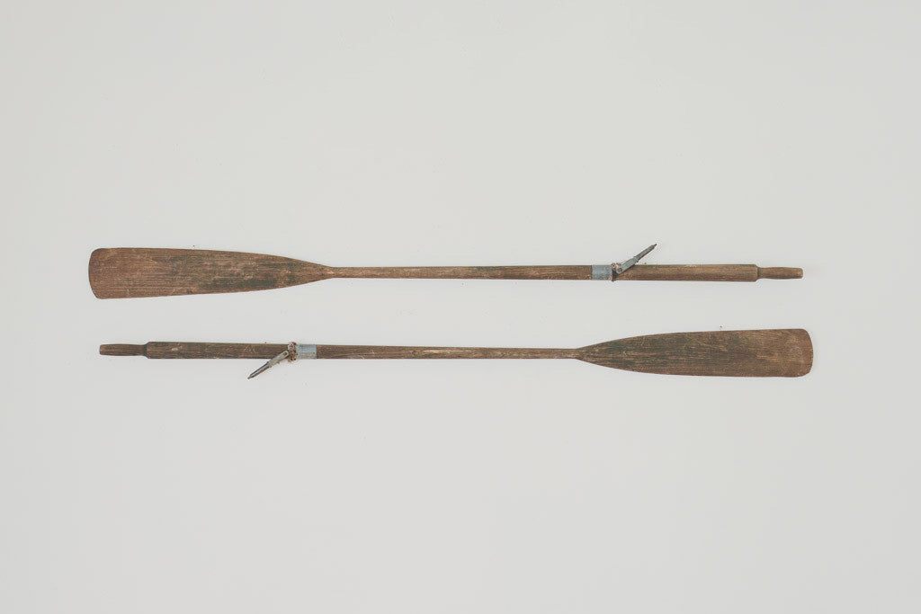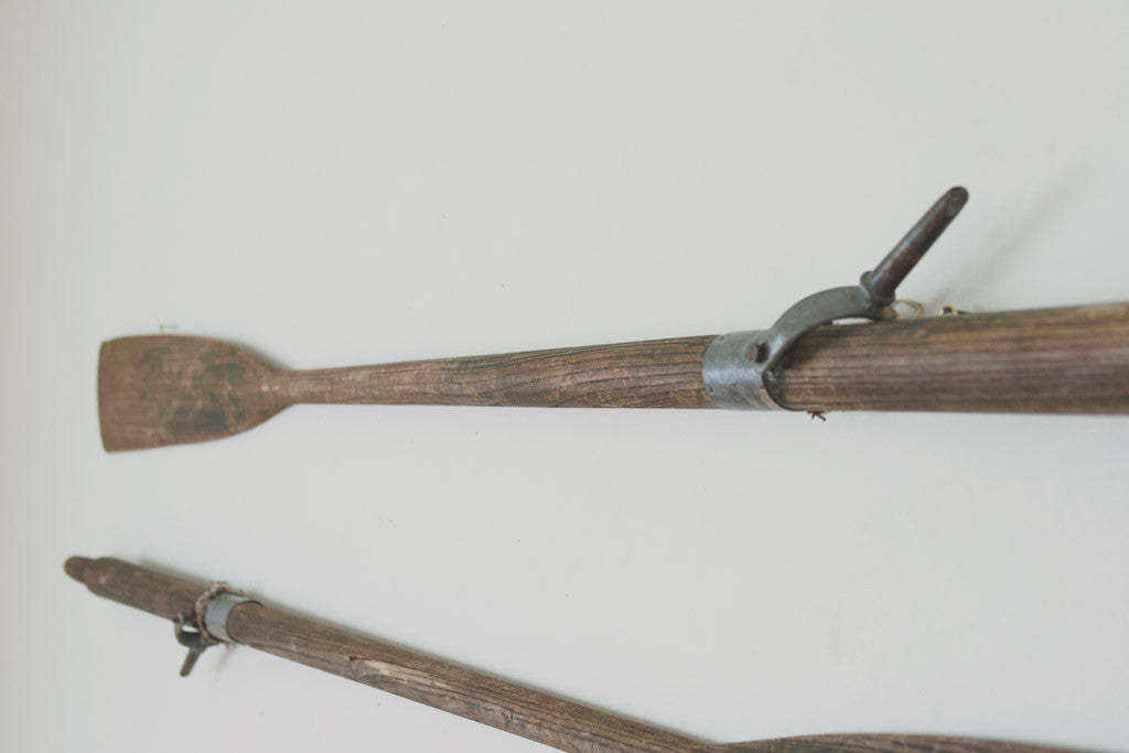 These vintage oars are dark distressed wood and metal hardware. They're in good shape with age related wear and are ready for mounting vertically or horizontally. Please see pictures for detailed condition.