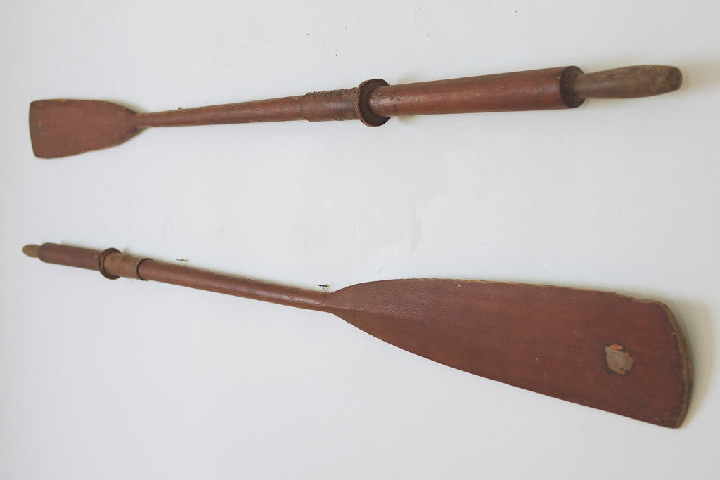 These vintage oars have a their original labels and leather grips. They can be mounted vertically or horizontally and are in great shape with age related distressing and wear. See pictures for detailed condition.