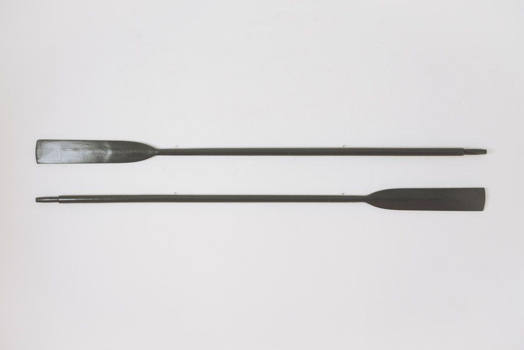 These extra long vintage oars have dark green paint over an original carved label. They can be mounted vertically or horizontally and are in good shape with age related wear. See pictures for detailed condition.