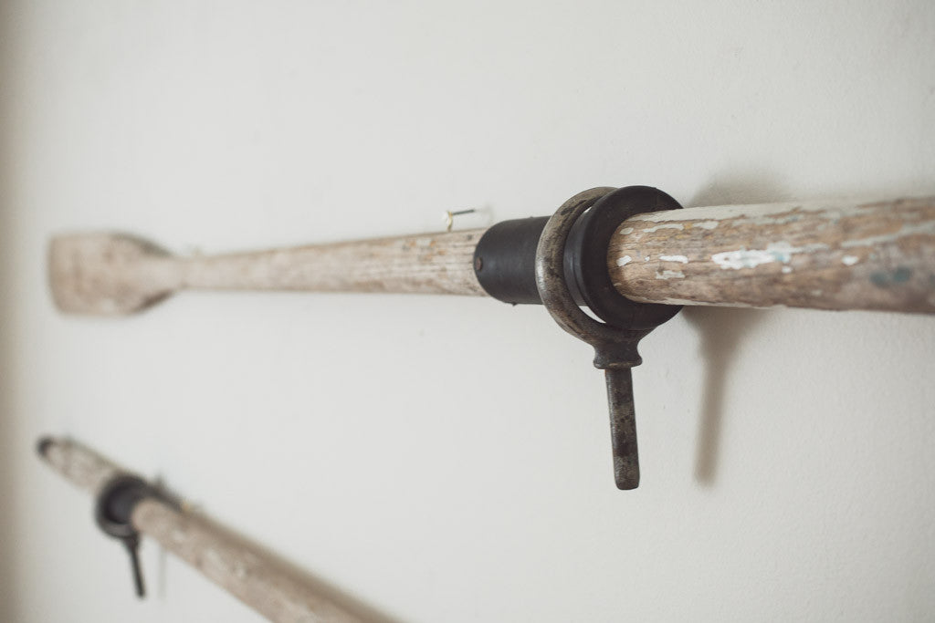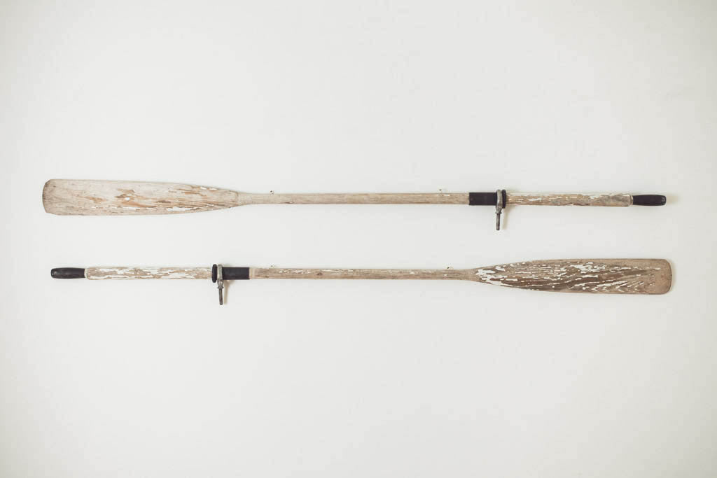 These vintage oars have distressed white paint over naturally greyed wood. They have eye hooks for mounting vertically or horizontally and are in good shape with age related wear. See pictures for detailed condition.