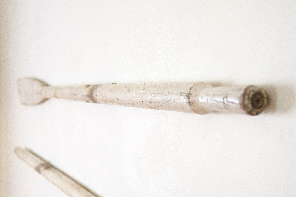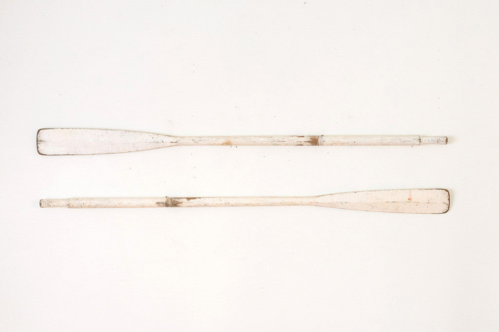 These vintage oars have a white painted finish. They are naturally distressed and have eye hooks for mounting vertically or horizontally. Please see pictures for detailed condition of this piece.