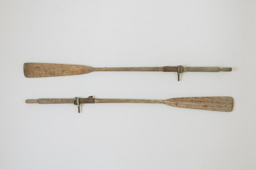 This pair of vintage oars have a their original hardware and leather grips. They can be mounted vertically or horizontally and in good shape with age related distressing and wear. See pictures for detailed condition.