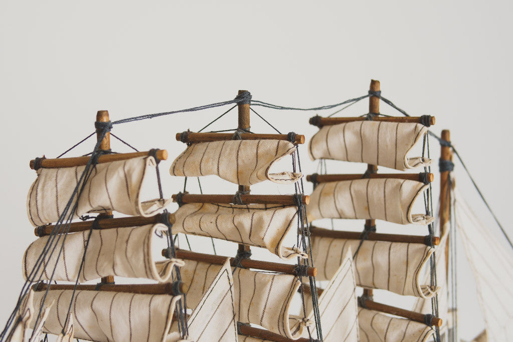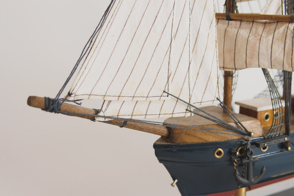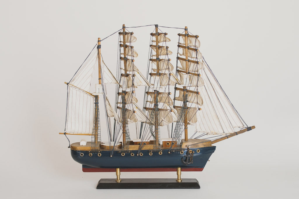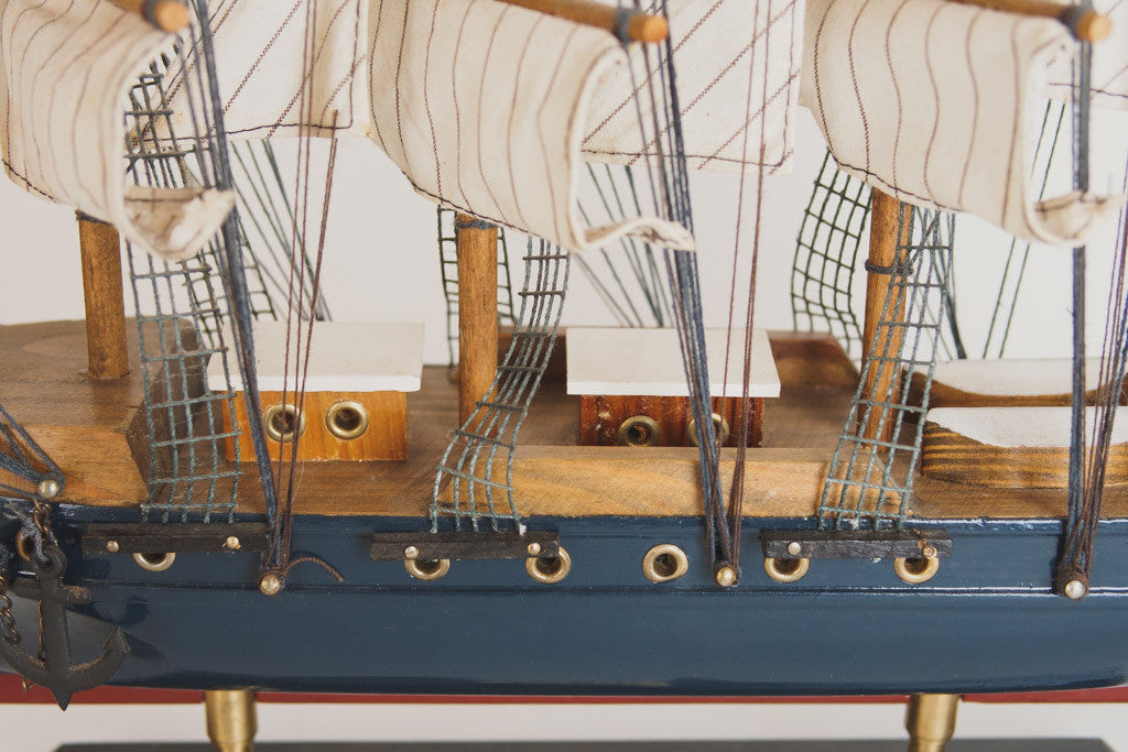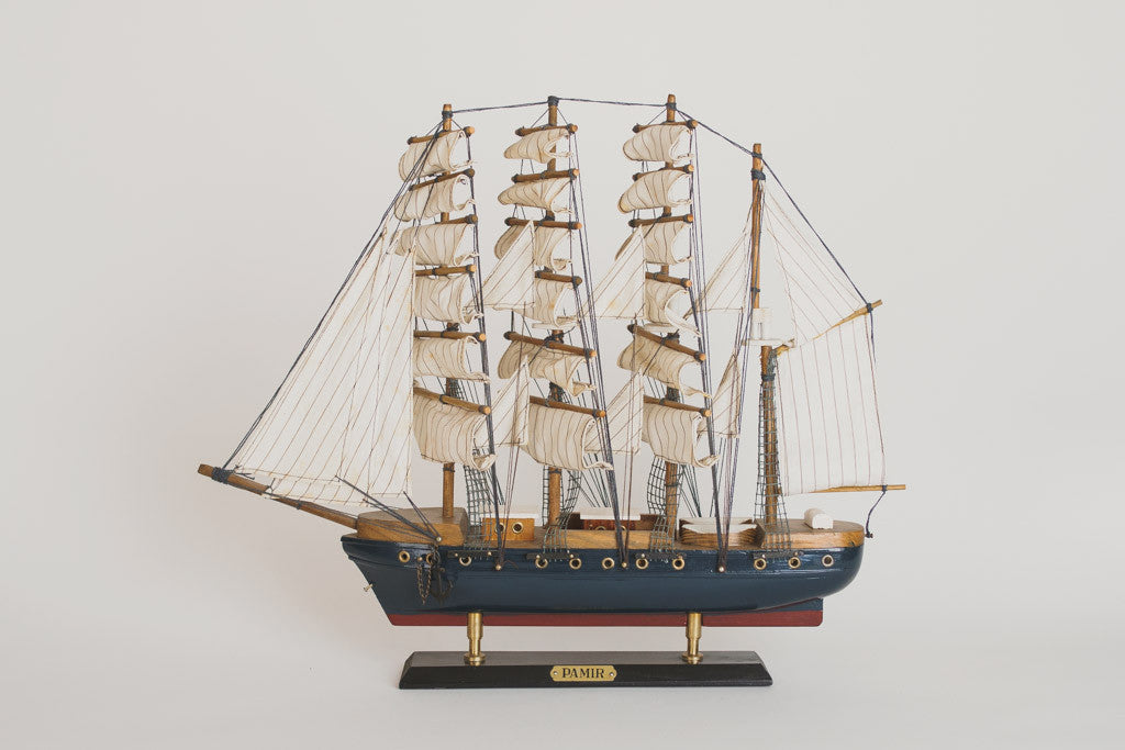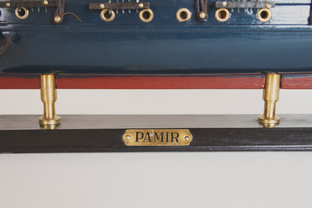 This handcrafted model ship is navy painted wood with great details, a built in stand and a plaque that reads, "Pamir". It's in good shape with age related wear. Please see pictures for detailed condition.