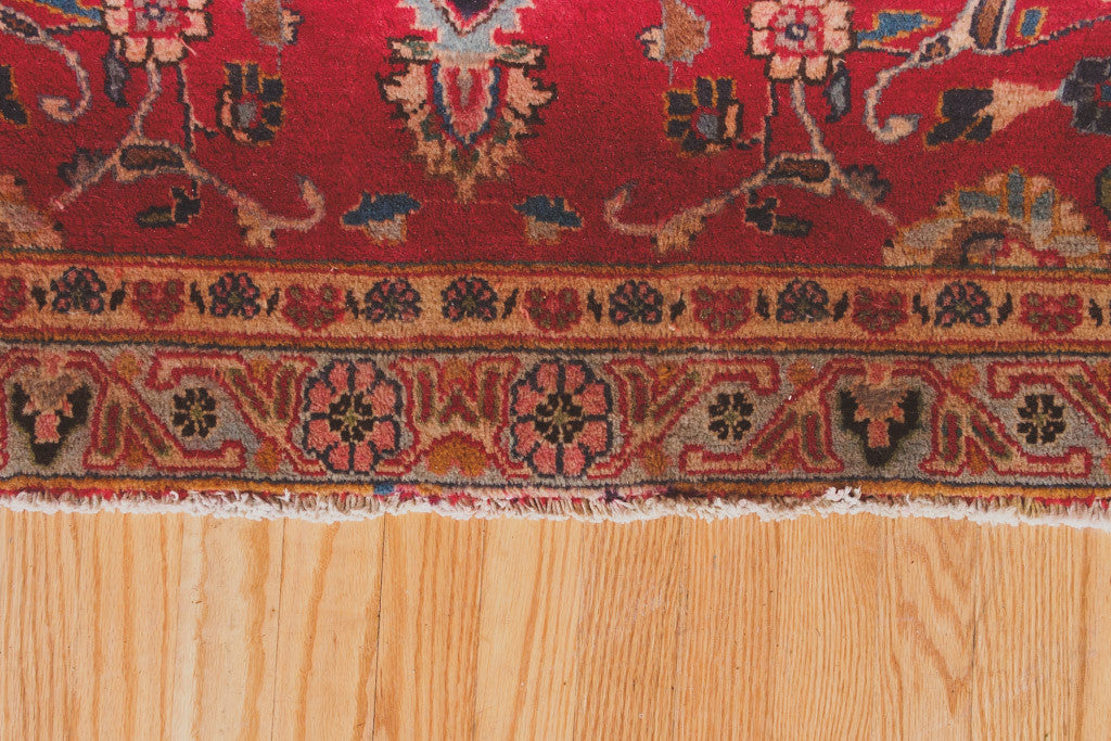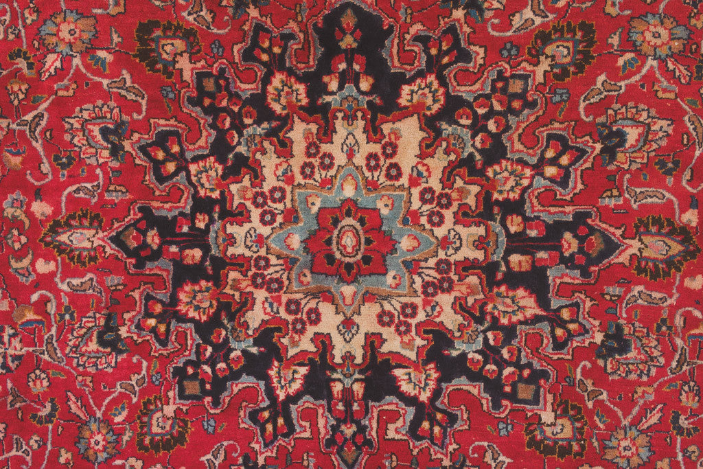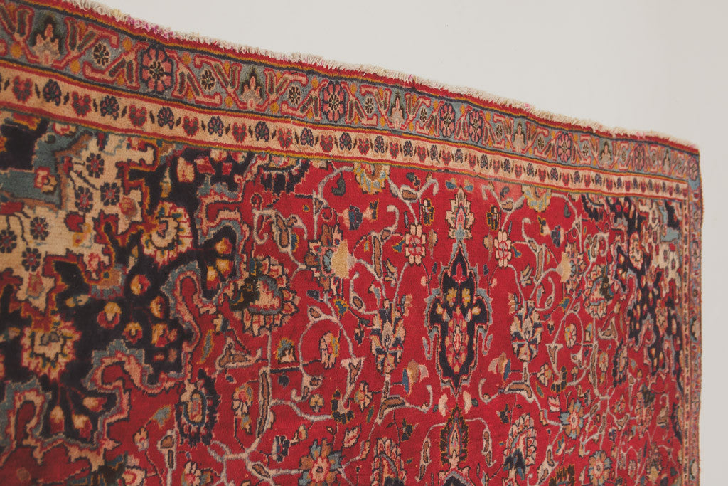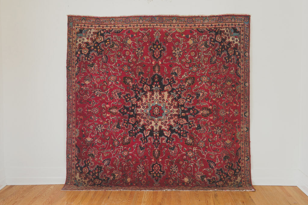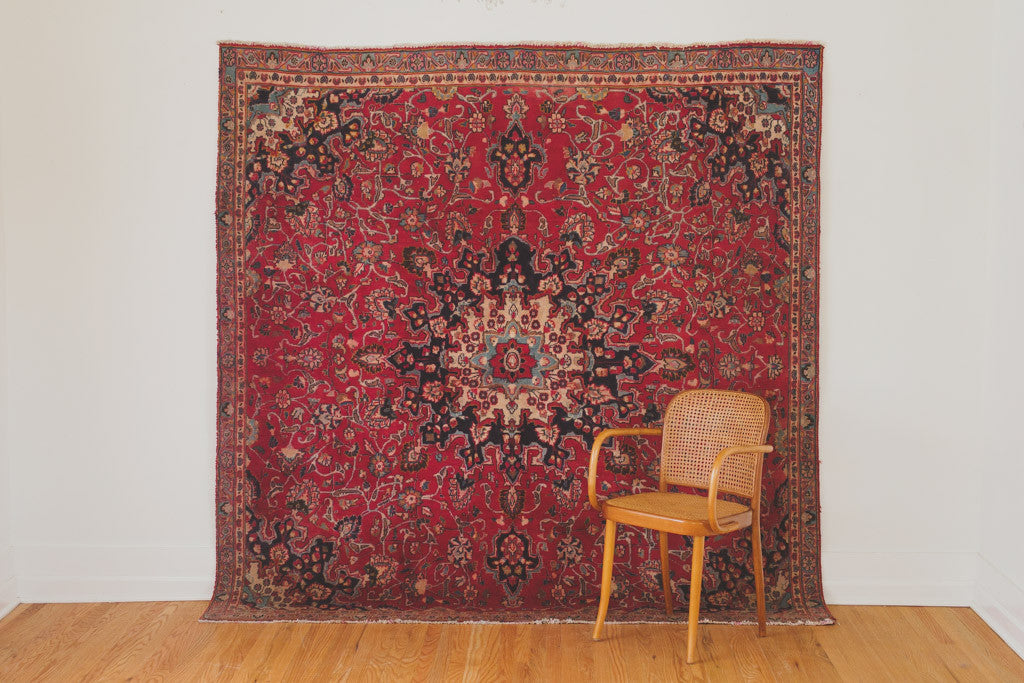 This large square-shaped vintage Persian rug has a bright red base with cream, light blue and navy accents and cream fringe. It's in good shape with some light age related wear. Please see pictures for detailed condition.