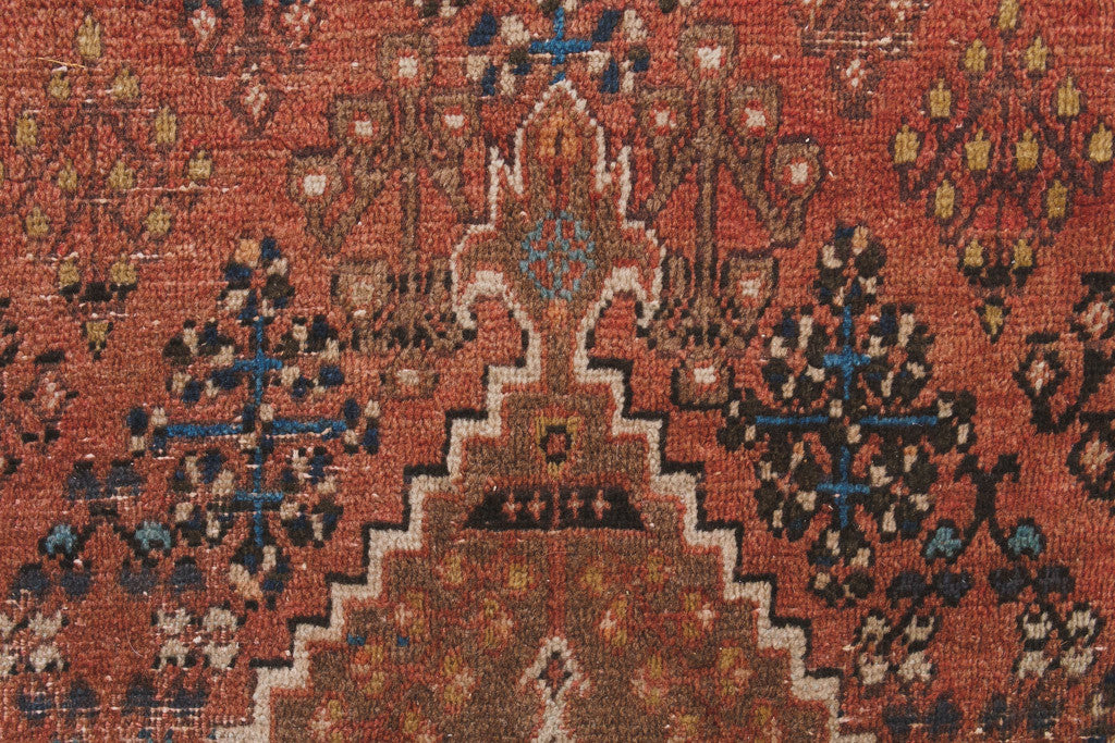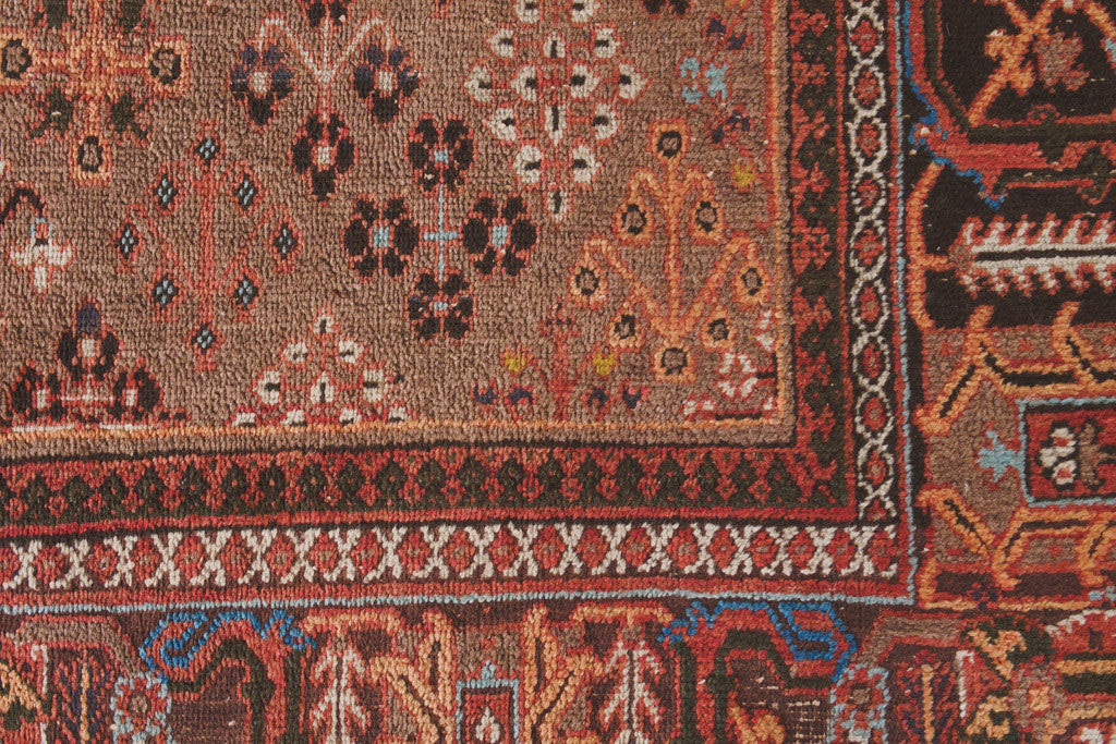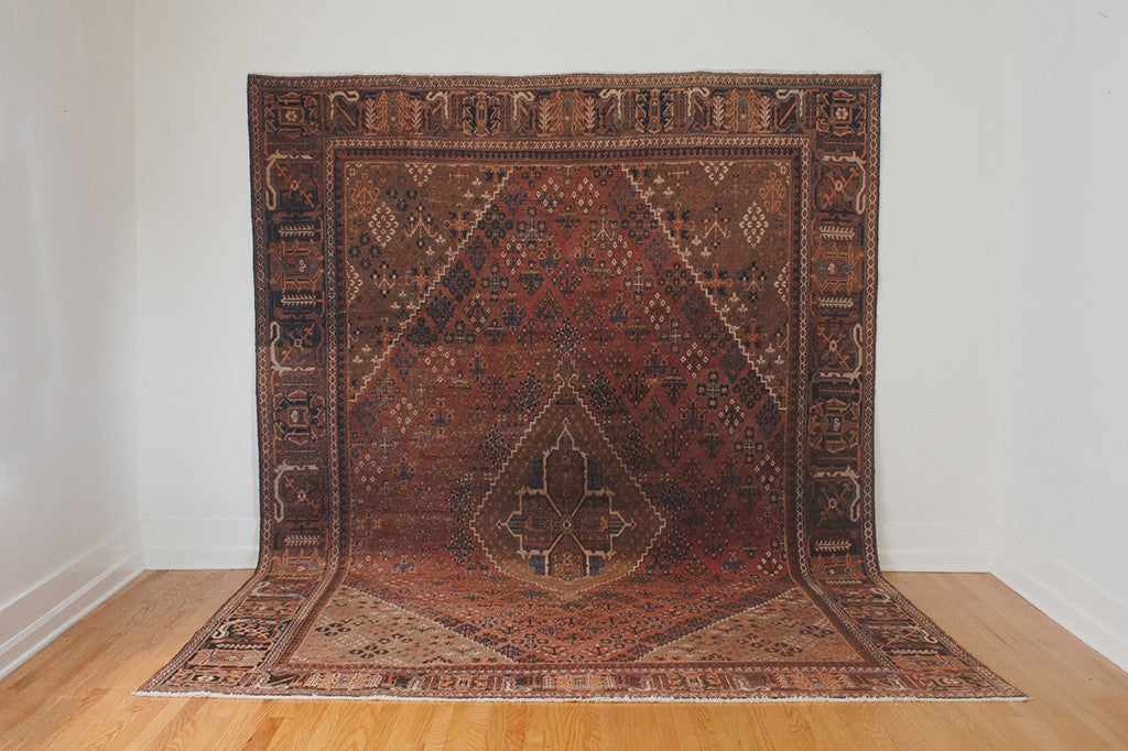 This vintage Persian handwoven wool rug has a muted burgundy base with shades of brown, blue and cream accents. It's a larger full room size in good shape with some light age related wear. Please see pictures for detailed condition.