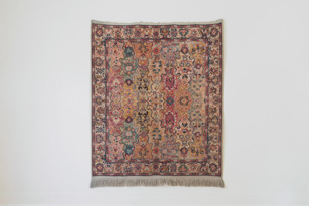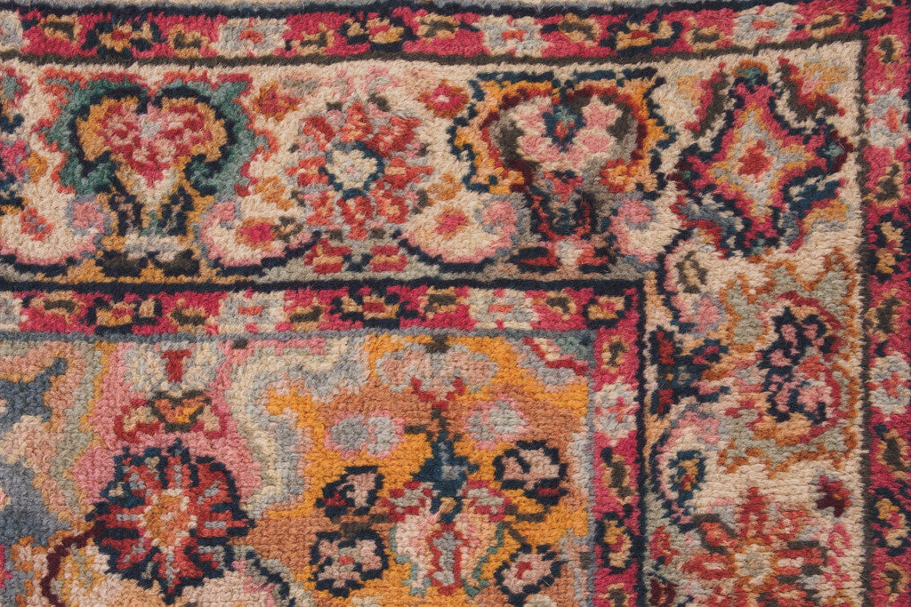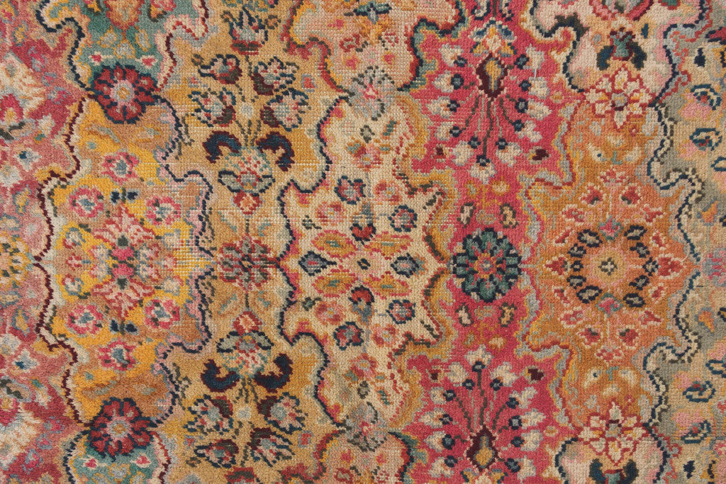 This vintage Persian style wool rug is hand knotted with shades of pink, yellow, teal, cream, burgundy and navy, and cream fringe. It's in good shape with age related wear. Please see pictures for detailed condition.