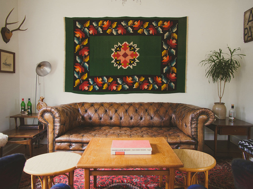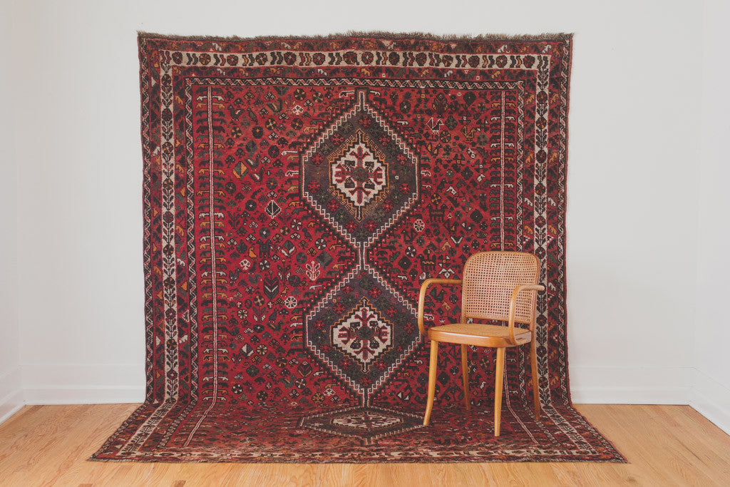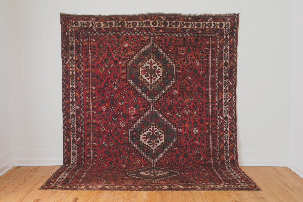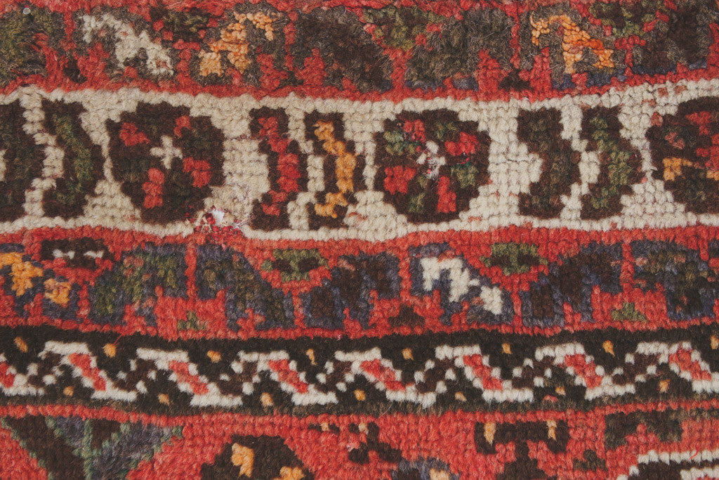 This large vintage Persian rug has a deep red base with cream, green, navy, orange, burgundy and black accents. It's in good shape with some light age related wear including two tiny holes. Please see pictures for detailed condition.
