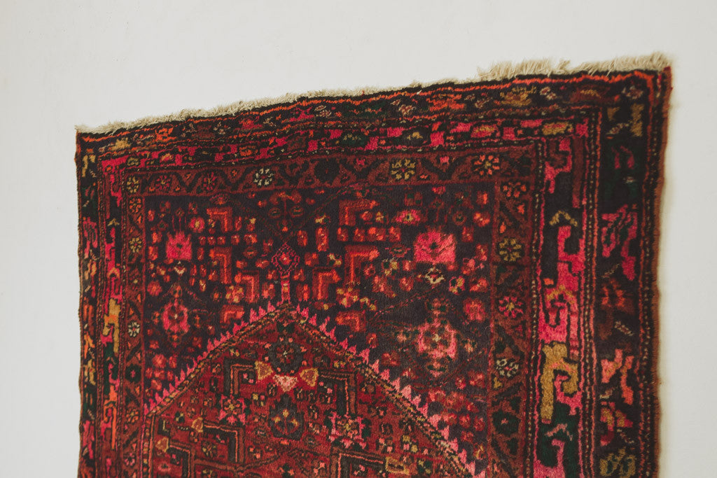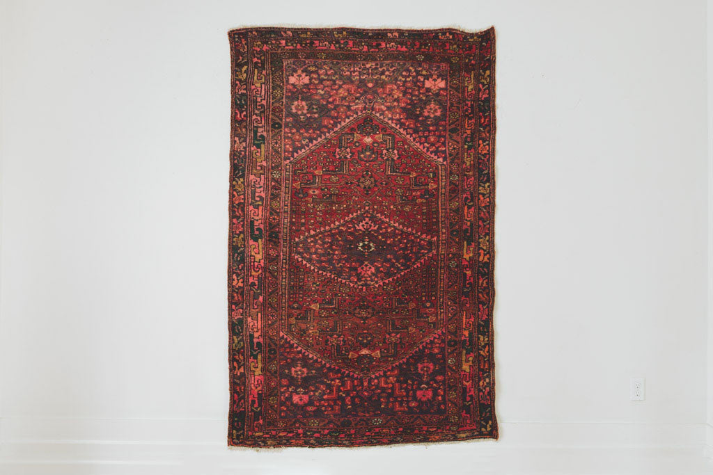 This hand knotted vintage Persian rug has a red base with pink, blue, gold and green accents. It's in good shape with age related wear. See pictures for detailed condition.