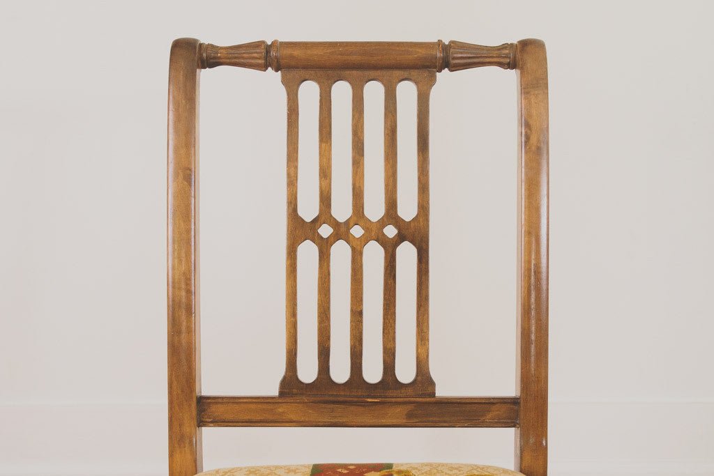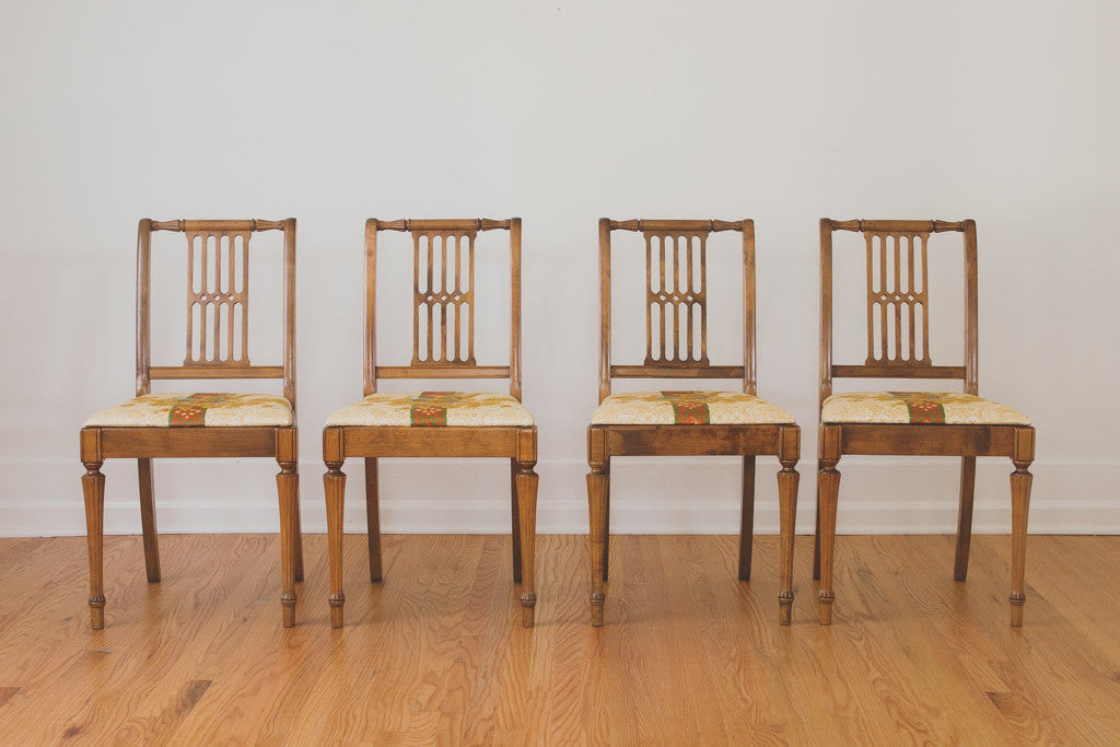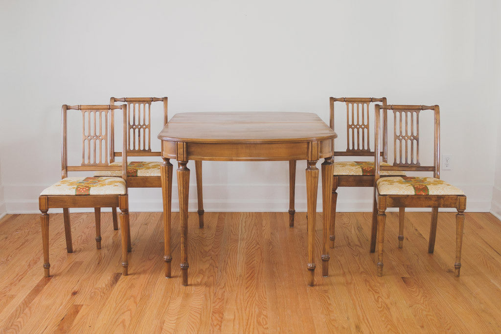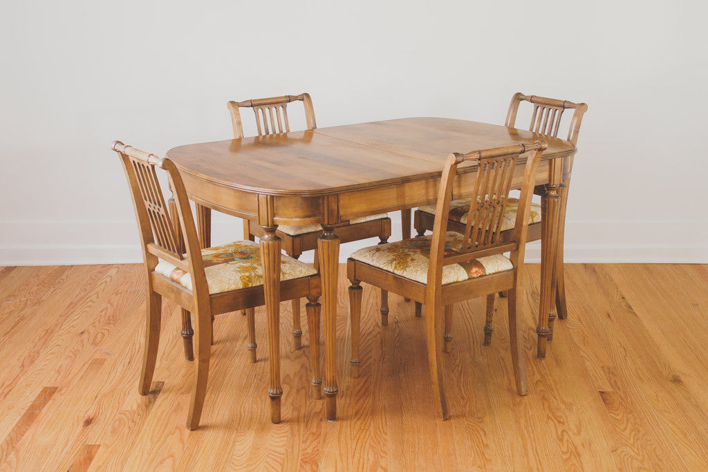 This vintage dining set was manufactured by the Northwest Chair Company in Tacoma, Washington. It has four upholstered dining chairs and an expandable table with two leaves. The upholstery is a vintage pheasant fabric in vibrant blues, greens and golds. This set is in great shape with some age related wear. Please see pictures for condition.