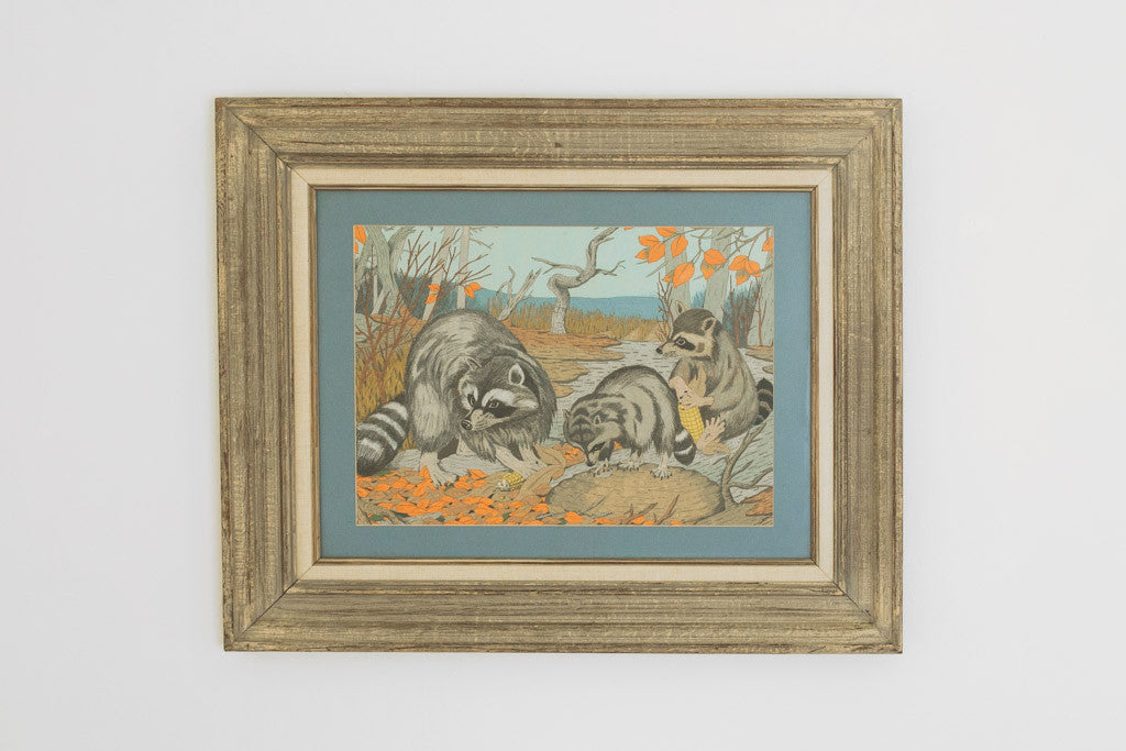 This vintage framed raccoon watercolor sketch has vibrant colors and is in good shape with age related wear. See pictures for detailed condition.