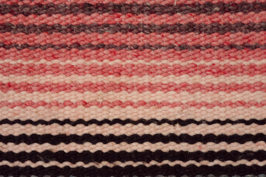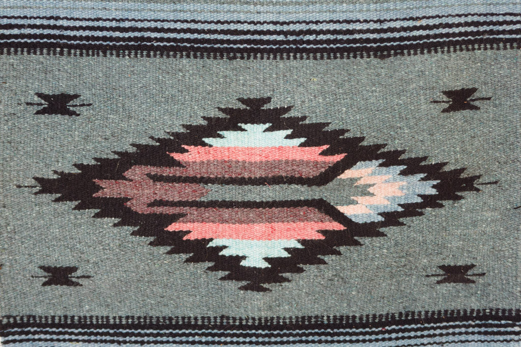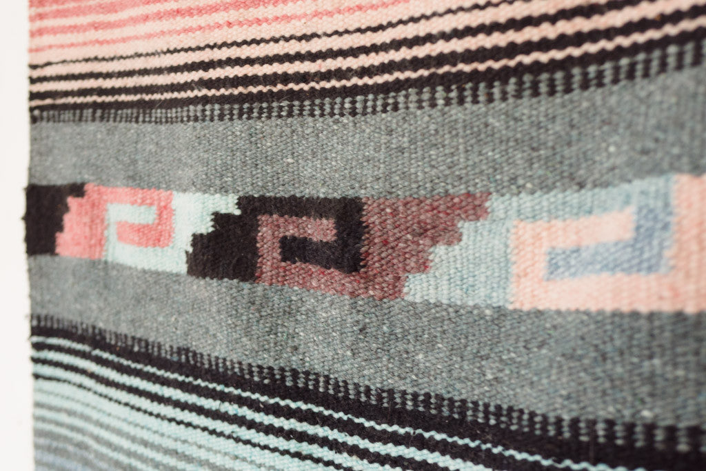 This vintage Southwestern kilim style rug has a grey base with pink, light blue and peach accents. It's in good shape with age related wear and could also be used as a wall hanging. See pictures for detailed condition.
