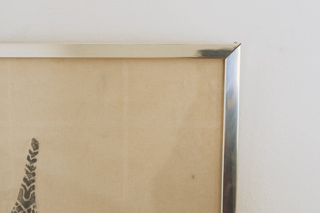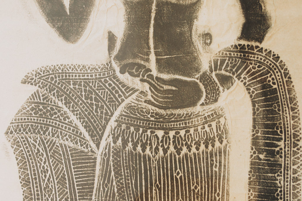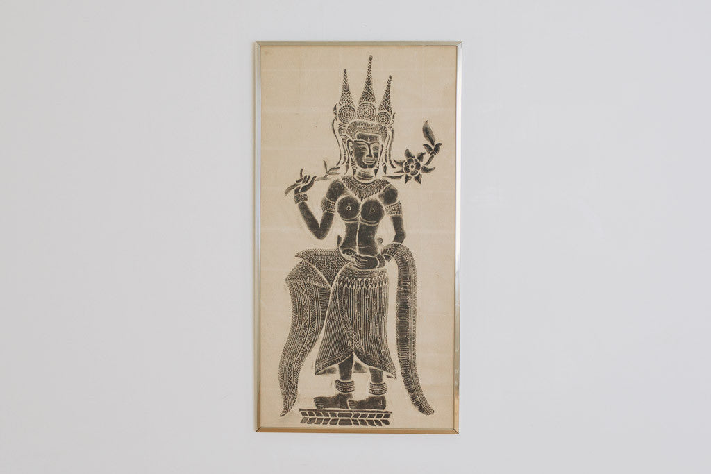 This vintage Thai temple rubbing is of a confident woman with a headpiece and a flower. It has a silver frame with glass front and is in good shape with age related wear. See pictures for detailed condition.
