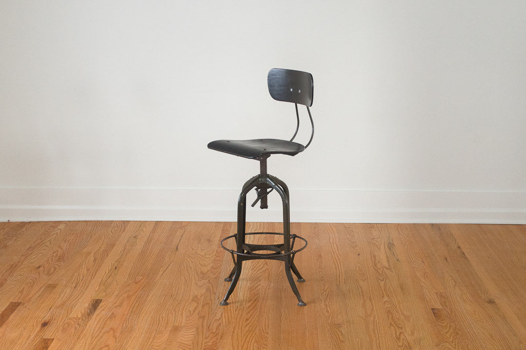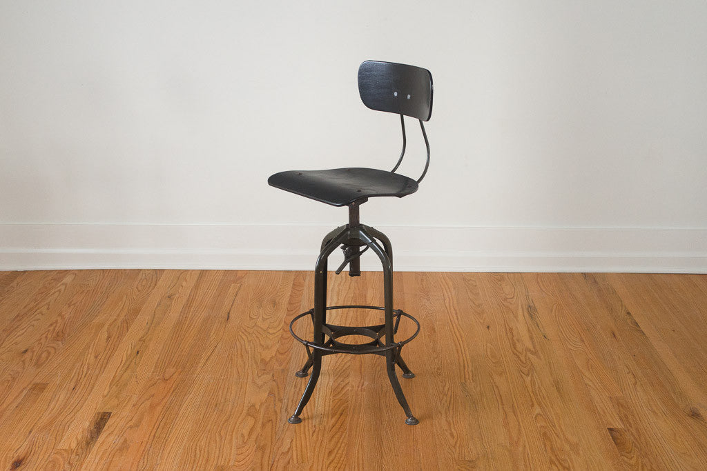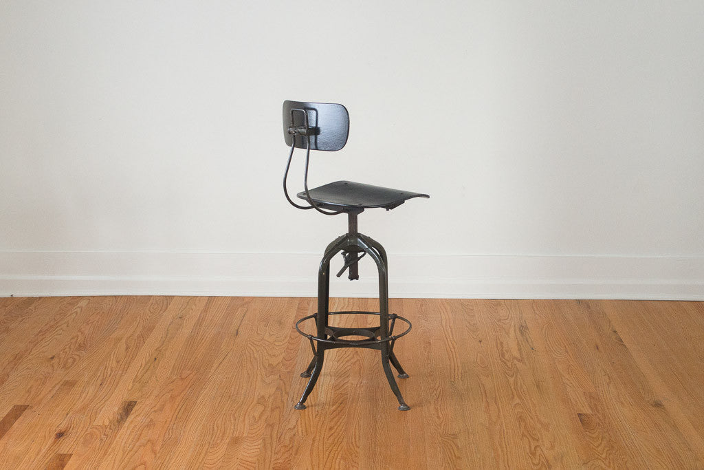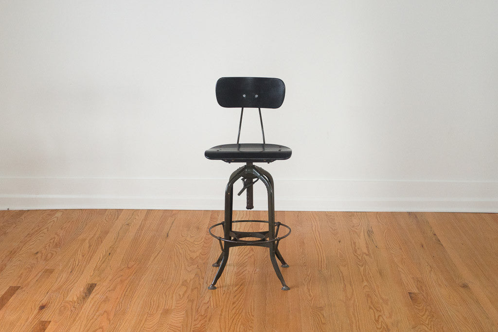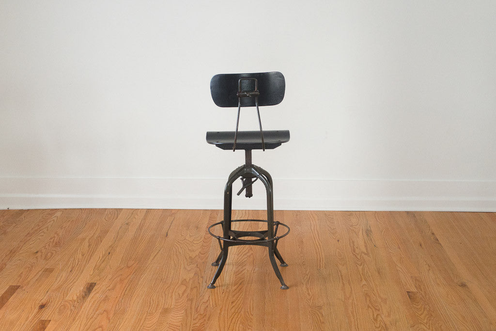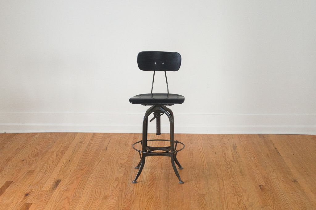 We have a custom painted vintage industrial draftsman's stool in our shop. This chair is an original UHL Steel stool manufactured by The Toledo Metal Furniture Company in Toledo, OH. The back rest is adjustable in height along with an adjustable seat height so you can make this chair fit you perfectly no matter what your preference is. The wood seat and back rest had been painted with a terrible faux marble pattern so we decided to go Restoration Hardware/French Industrial with it and paint them semi-gloss black. The steel base is in original condition with great patina and character. We have two Toledo stools at our kitchen island and we love them. This chair would also be great at a drafting table desk.